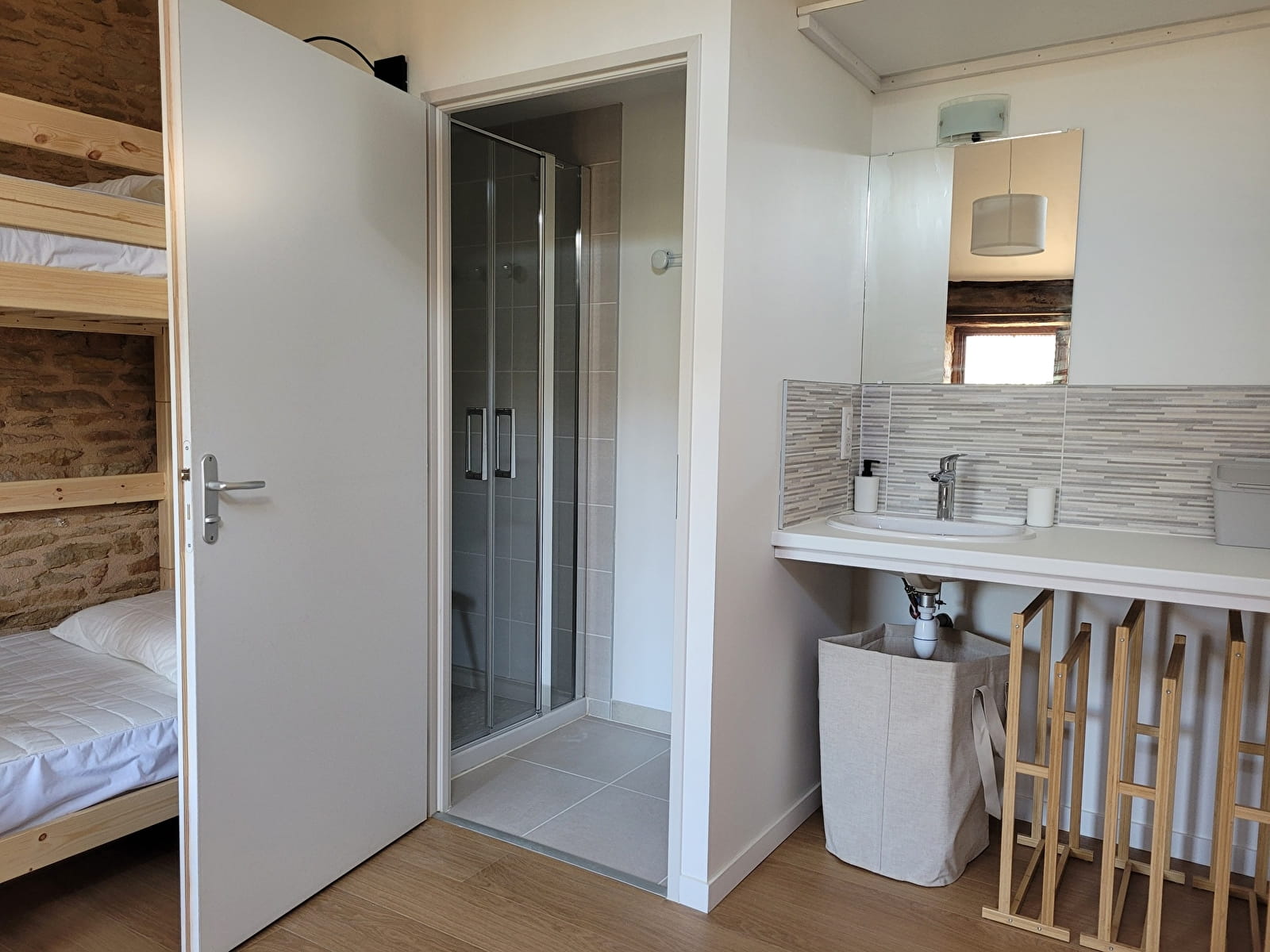 3 chambres sont en prestation chambre d'hôtes. L'une d'elles peut être utilisée en partage avec d'autres, pour un prix léger : elle contient 3 lits en 90 dont 2 en superposés, une salle de douche et un lavabo privatifs, sur 20 m². Le wc est au RdC.