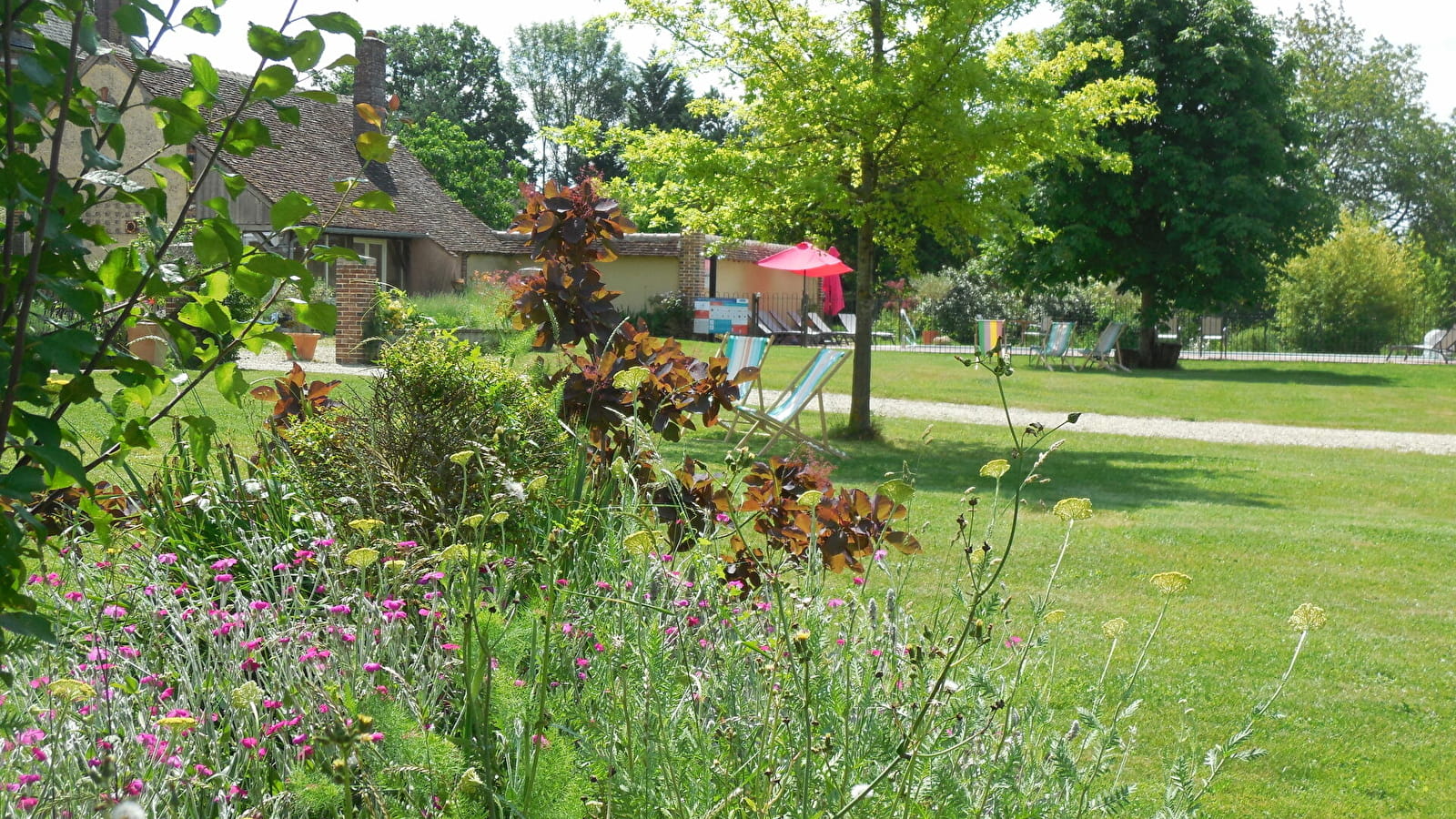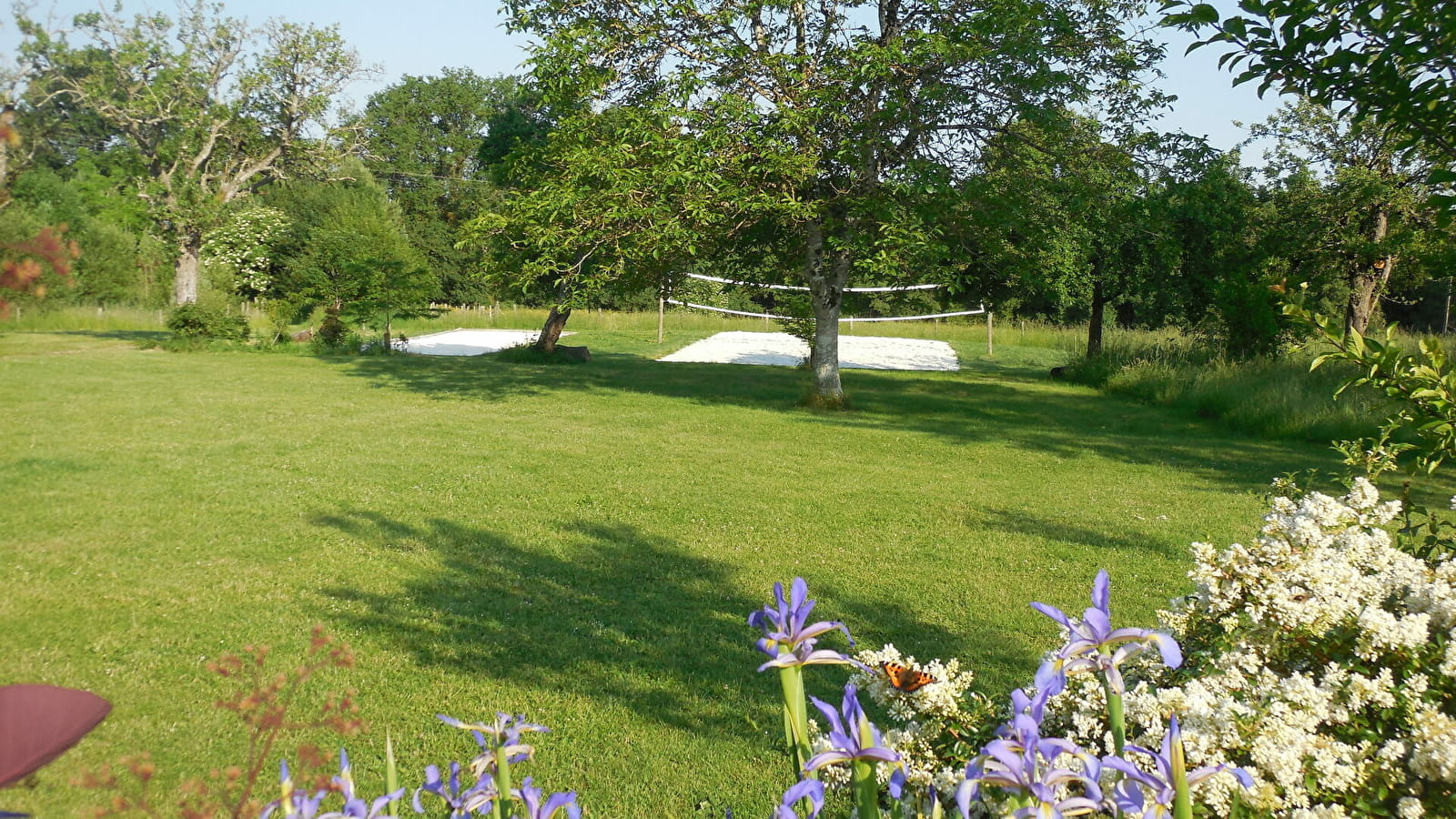 En extérieur, terrain de beach volley, terrain de pétanque, cages de foot, parc de plusieurs hectares. Grande terrasse contre un pignon plein sud, mobilier de jardin.