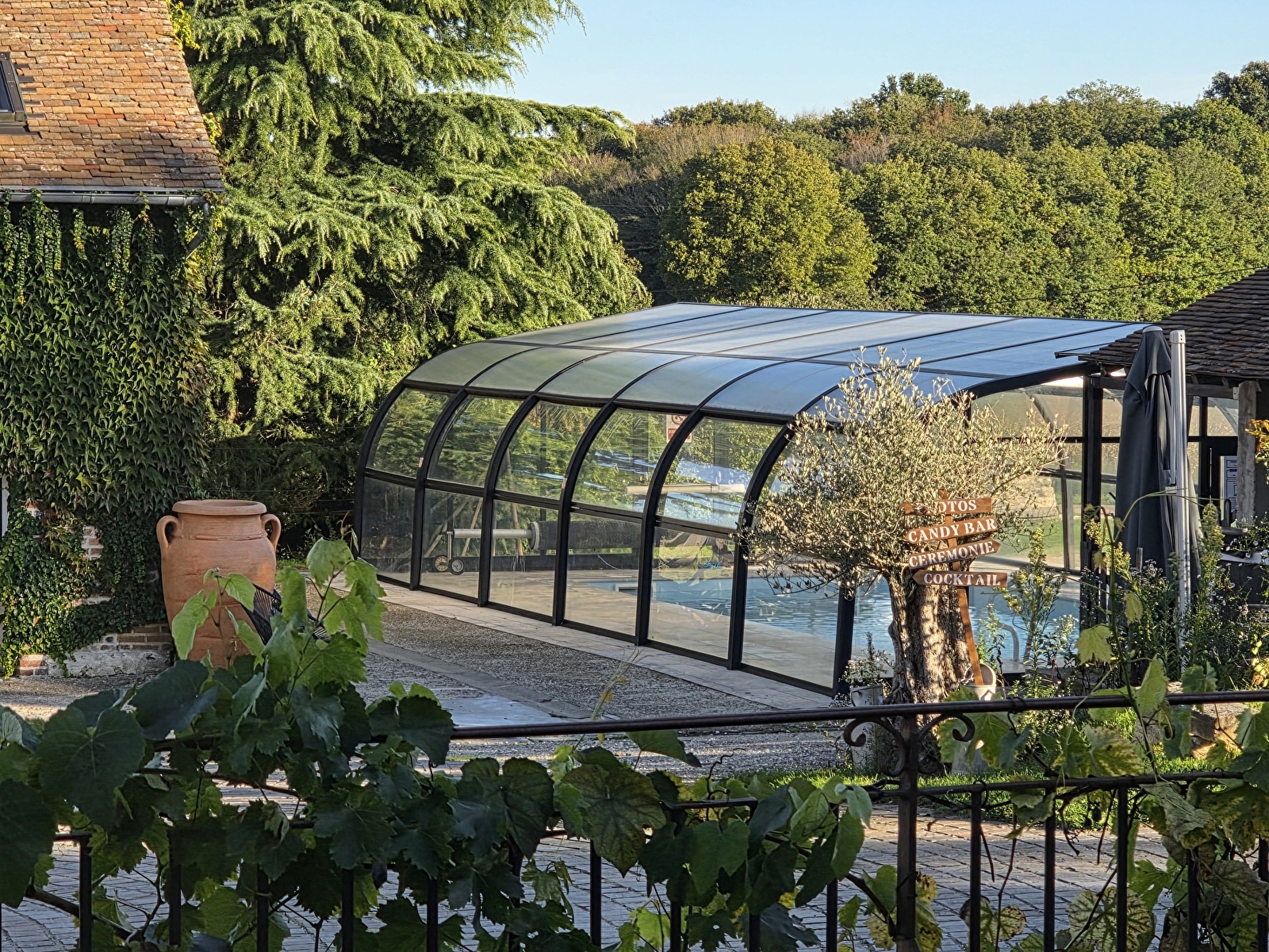 Une élégante verrière de réception pouvant accueillir jusqu’à 128 convives, des chambres climatisées pour 70 personnes, et de nombreux équipements de détente : piscine chauffée, terrain de tennis, jacuzzi, sauna, billard, flipper, baby-foot, ping-pong, pétanque...