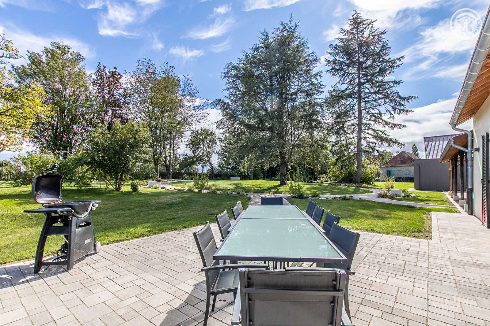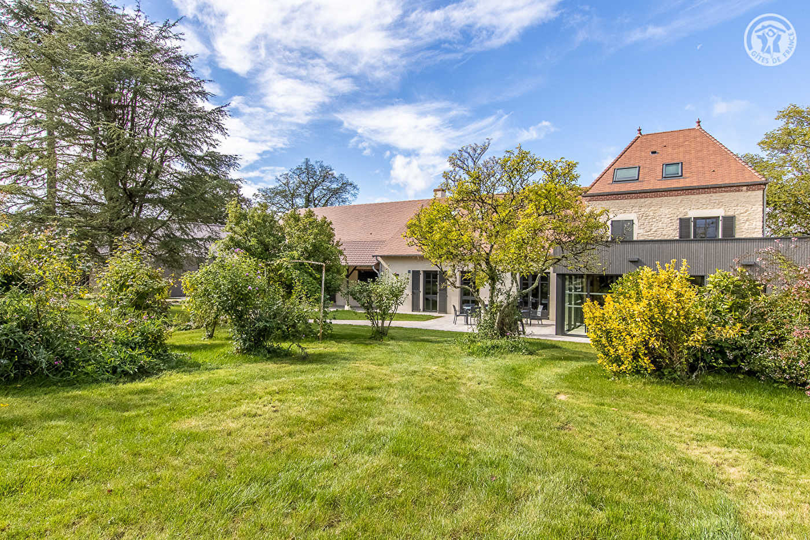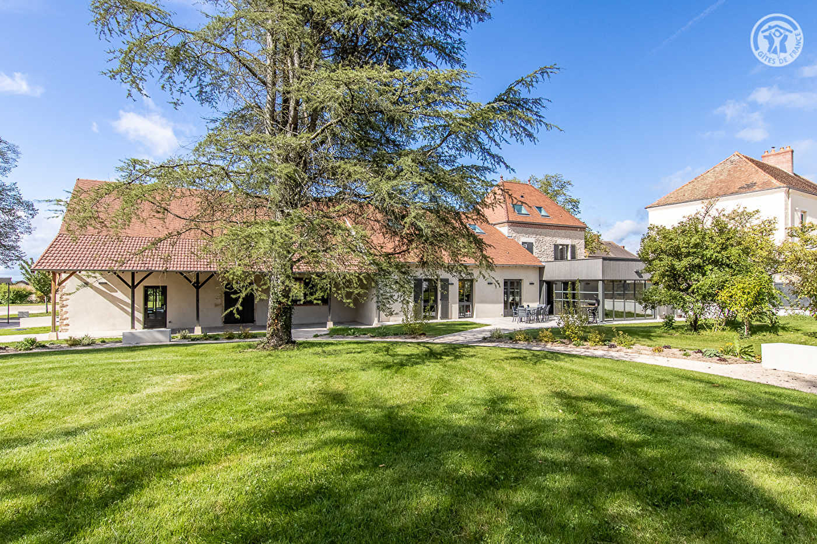 Élégante demeure de caractère du XIXe pétrie d'histoire (tour à tour forge, magasin de réparation de cycles, quincaillerie, poste à essence…), littérale "âme" historique du bourg dont subsiste la ravissante devanture d'origine, soigneusement restaurée via une belle extension contemporaine. En pleine campagne bressane, blotti au calme au cœur d'un paisible village typique doté d'une base de loisirs exceptionnelle jouxtant le gîte (insolite & rare terrain de baseball, terrain de foot, tennis, terrain de basket, aire de jeux enfant, parcours sportif & santé), d'une église romane classée du XIe et d'un reposant site aquatique aménagé (étang de pêche réputé, zone écologique préservée, parcours pédagogique & aire de pique-nique). Spacieux gîte de grand confort. Vaste pièce de vie lumineuse. Charmant cachet campagnard aux accents contemporains, mixant esprit "scandinave" au minimalisme douillet & touches "industrielles". Ambiance zen & douce sublimée par les riches traces du passé (poutres, mur en pierres, charpente d'origine). Beaucoup de charme & style. Terrasse exposée & ombragée ouvrant sur un magnifique jardin paysagé de 2000m² (arboré & fleuri), littéralement "tiré au cordeau".
