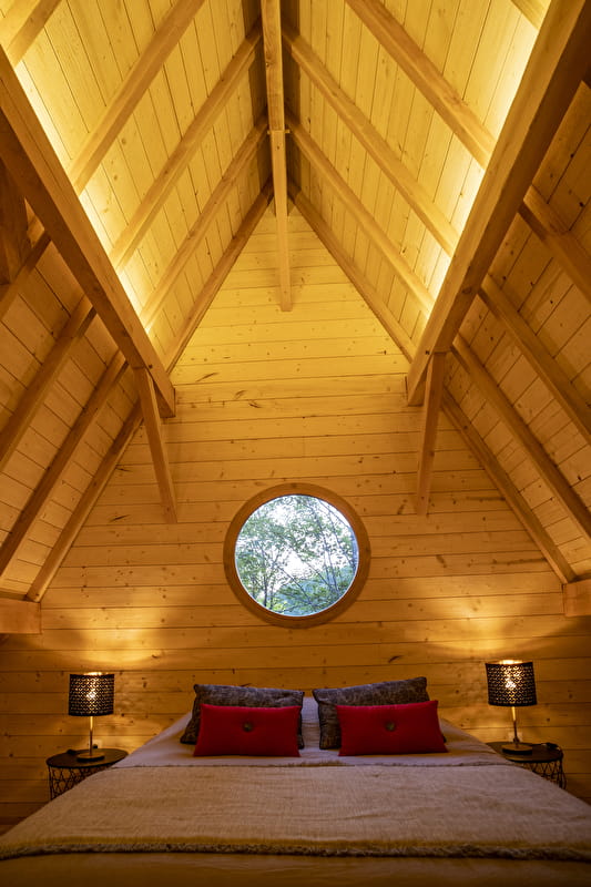 La cabane féerique est sur deux niveaux, pour multiplier les ambiances. Au rez de chaussée, elle offre un grand salon et un espace repas, puis une salle d’eau avec douche à l’italienne, lavabo et toilettes eau. La tourelle est habillée d’une grande banquette. L’accès à l’étage se fait par une échelle. Sous la charpente de sa toiture originale, une chambre spacieuse est éclairée par une fenêtre ronde donnant un point de vue exceptionnel sur l’étang.
