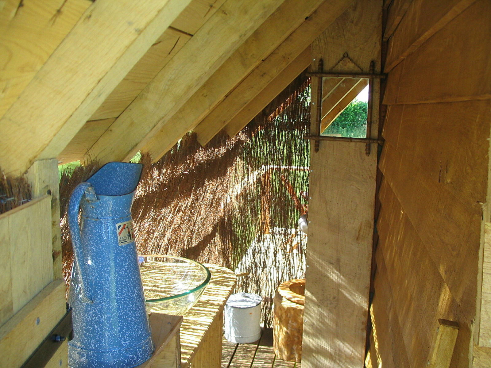 cabane construite avec le bois abattu et scié sur la propriété par nos soins. chauffage par poele à bois, éclairage à la bougie et lampe à les rechargeable par panneaux solaire, toilette sèche, mise à disposions de produits de toilettes écologique (savon, shampoing et dentifrice) pour préservation de l'environnement