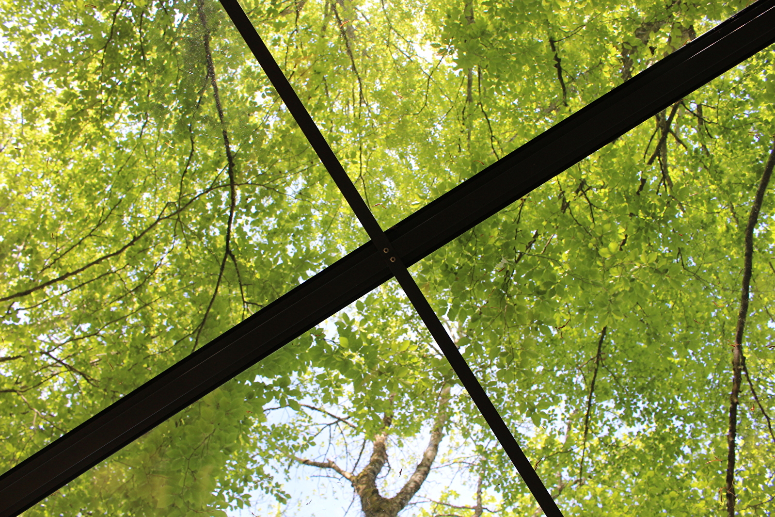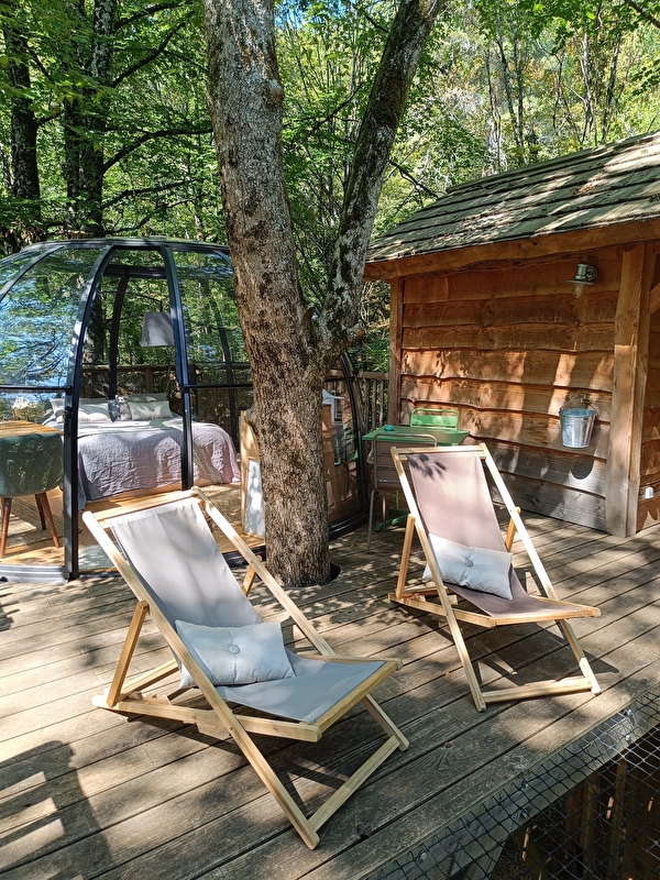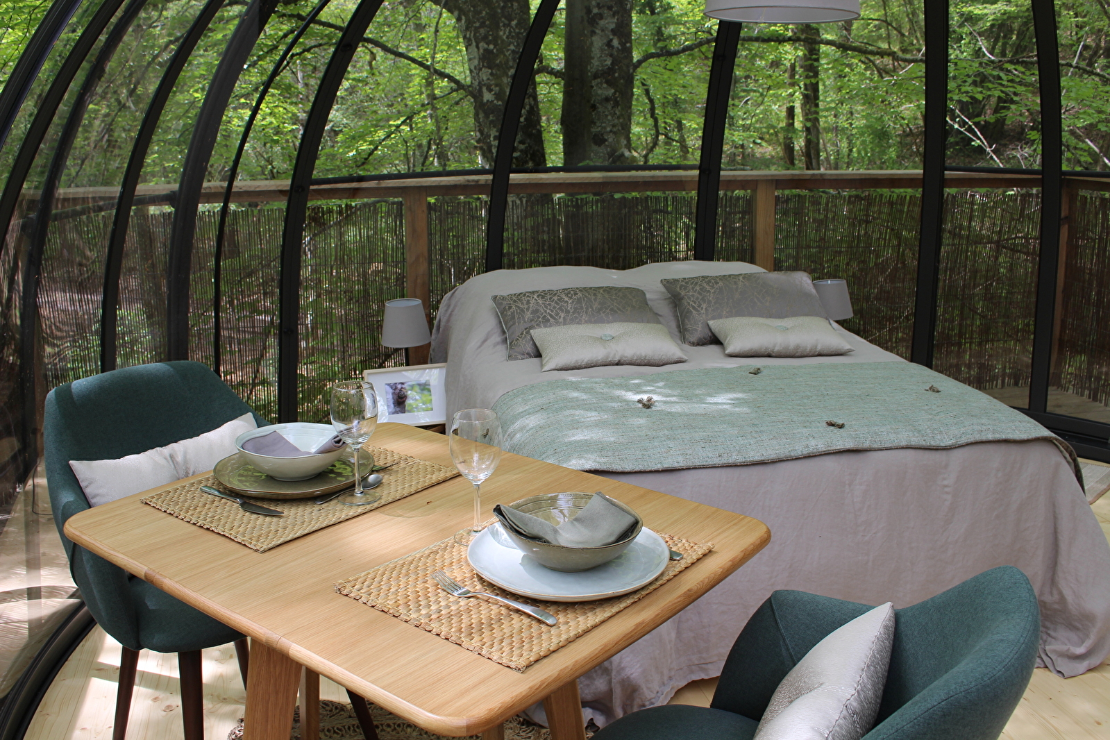 Le dôme est niché entre les têtes d’arbre. Du lit de 140*190 (dressé à votre arrivée), vous pourrez observer le ciel et la forêt telle une chouette, ce, sans aucun vis à vis. Sur la terrasse, vous pourrez vous nicher dans le filet encastré.