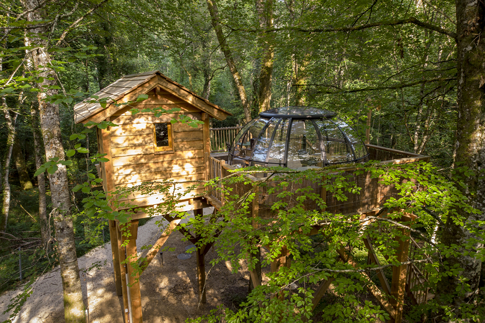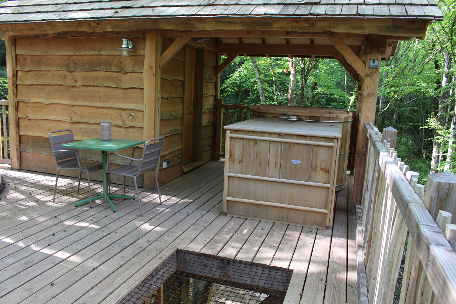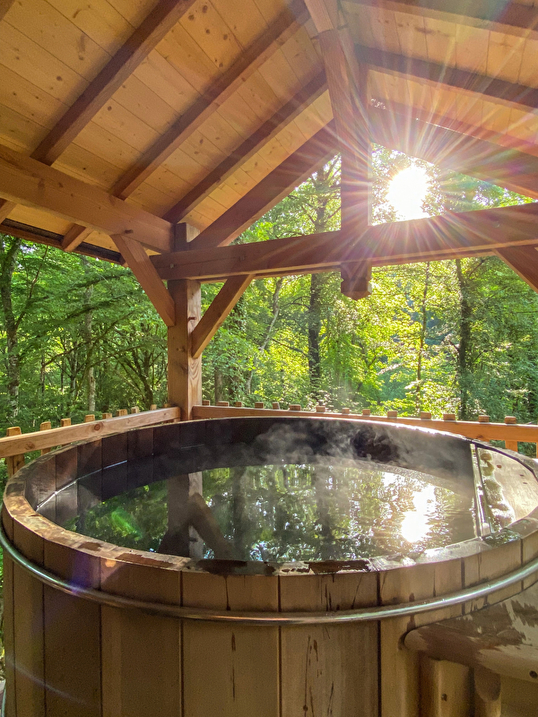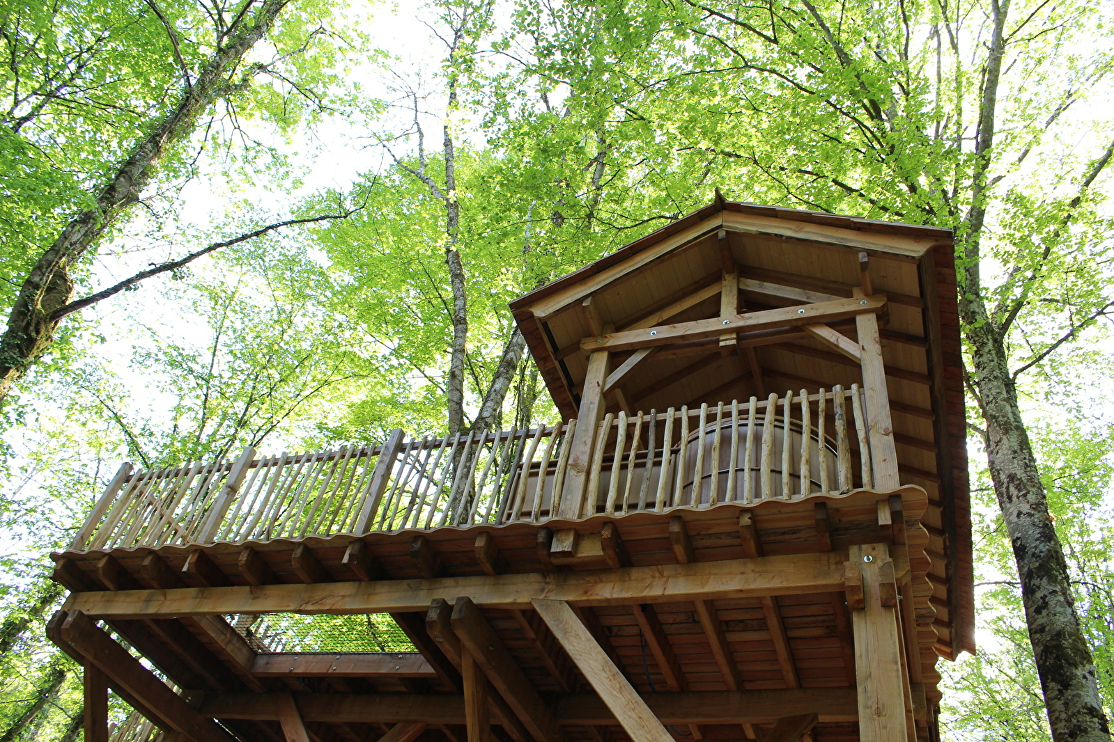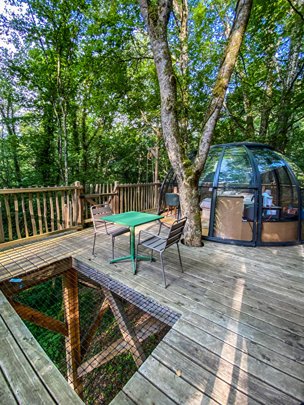 Un escalier balancé courbe vous permettra d’atteindre la plate-forme sur pilotis à 6m du sol (40m²). Une fois là-haut, vous découvrirez le dôme dédié à l’espace repos (salon – chambre), la cabane - salle d’eau (douche à l’italienne, lavabo et toilettes eau) et sous son auvent, le bain nordique. Ce dernier sera chaud à votre arrivée et à votre seule disposition !