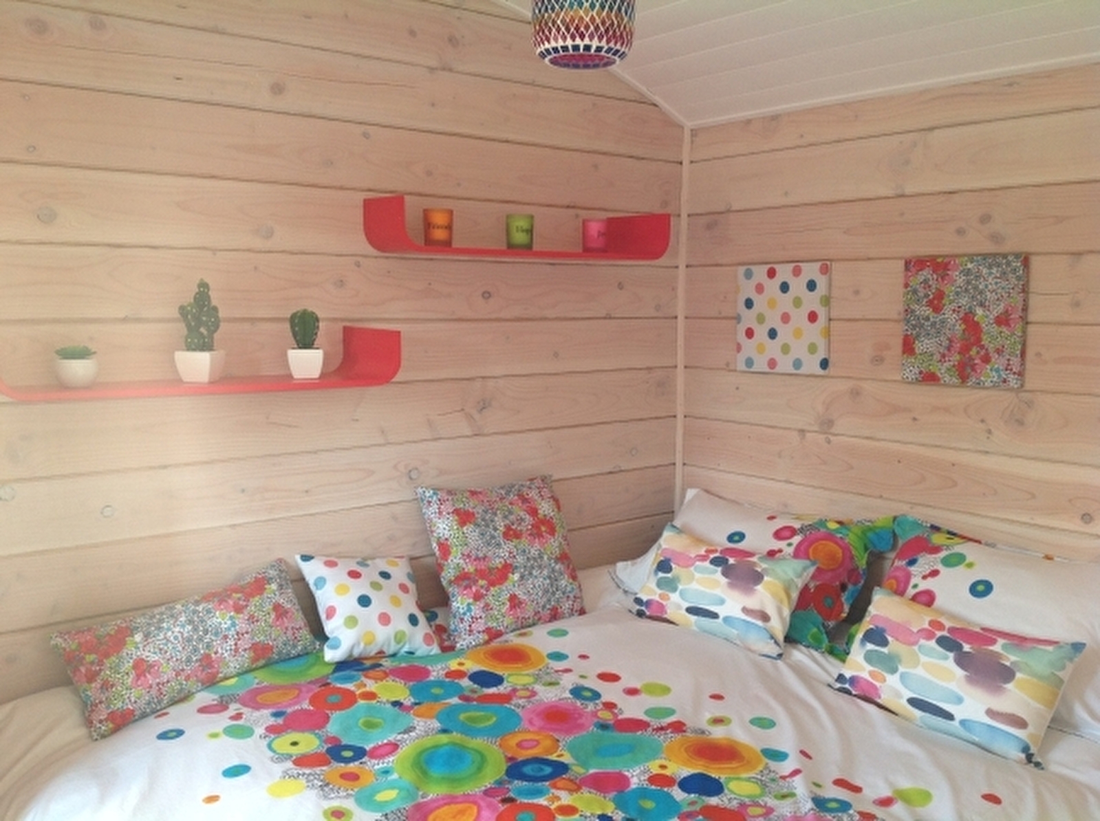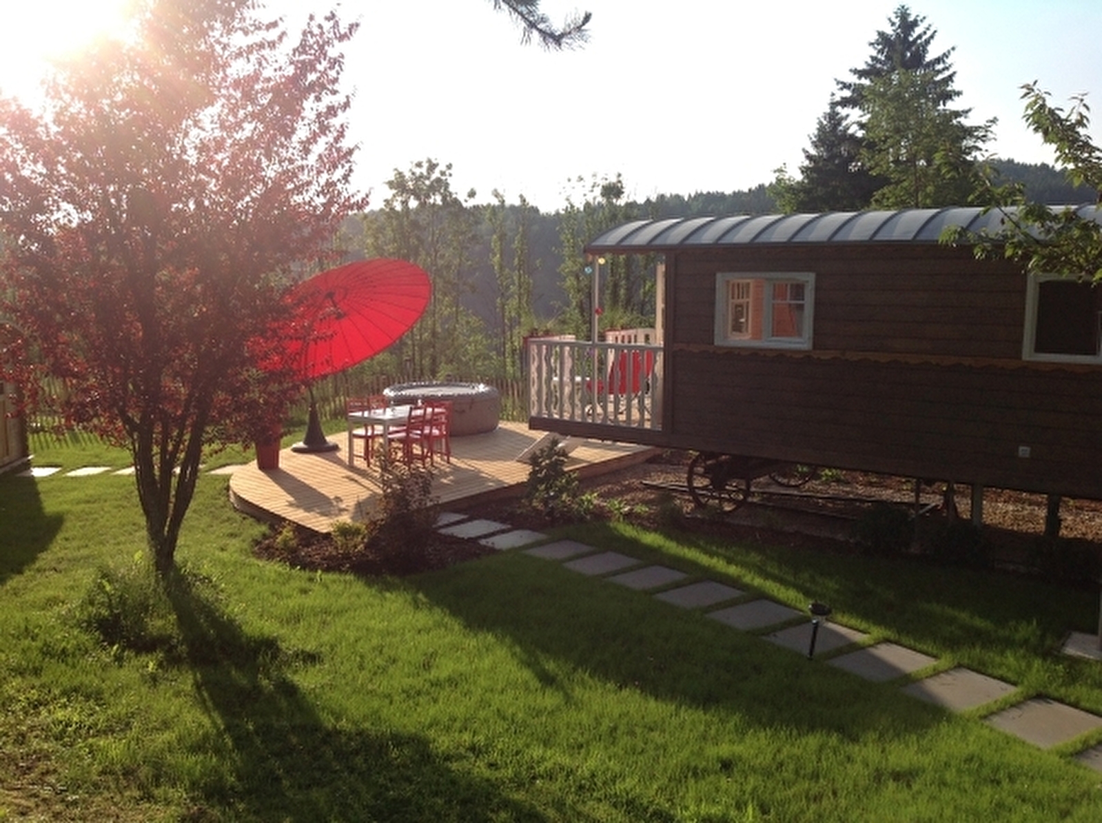 Roulotte Arc-en-ciel de 18 m² située dans une propriété privée. Elle se compose d'une chambre indépendante avec un lit 160 (couette et drap fournis), 1 BZ 140 (couette et drap fournis), d'une cuisine entièrement équipée, d'une salle d'eau avec douche, lavabo et WC (linge de toilette et drap de bain fournis), et d'une terrasse avec salon de jardin et jacuzzi. Wifi accessible, télévision, garage moto. Prix indiqué pour deux personnes - 5€/personne supplémentaire.