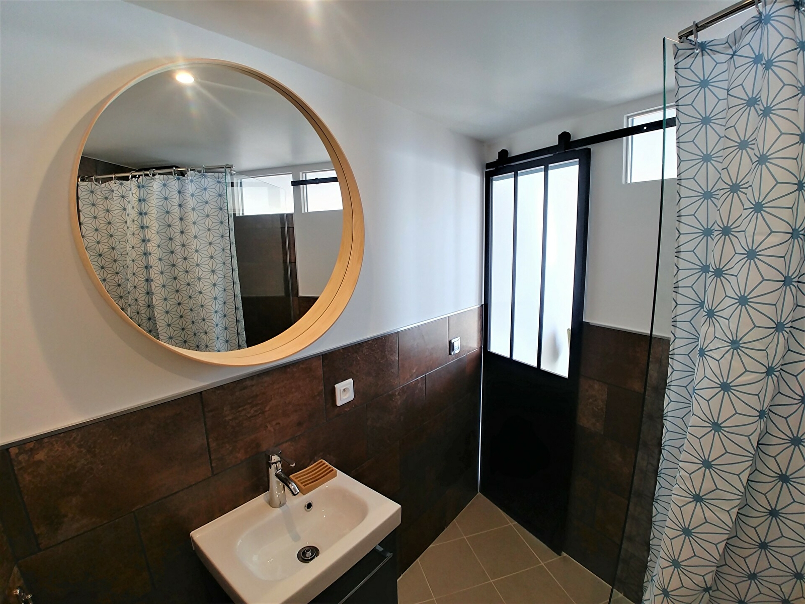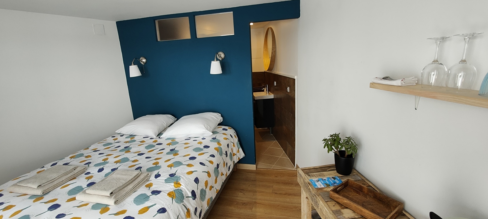 Une chambre de 15m2 composée d'un espace nuit (lit 160x200cm), d'un espace détente (machine à café, bouilloire), de sa salle d'eau privée (douche à l'italienne) et d'une terrasse privative de 25m2 avec fauteuils, table basse et parasol.