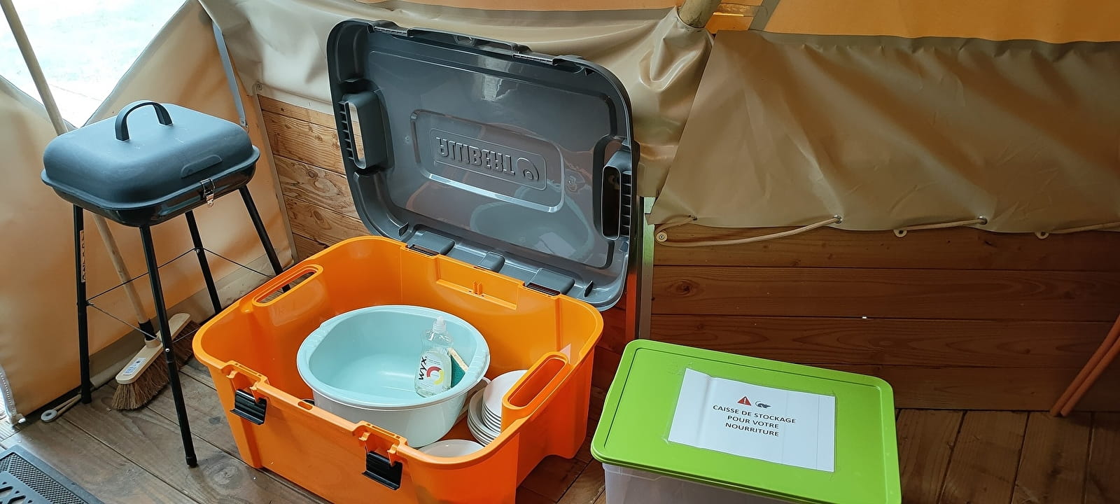 un espace de vie équipé de 1 table et 4 chaises, 1 réchaud à gaz à 2 feux sur son meuble support (bouteille de gaz fournie), 1 kit vaisselle, 1 réfrigérateur