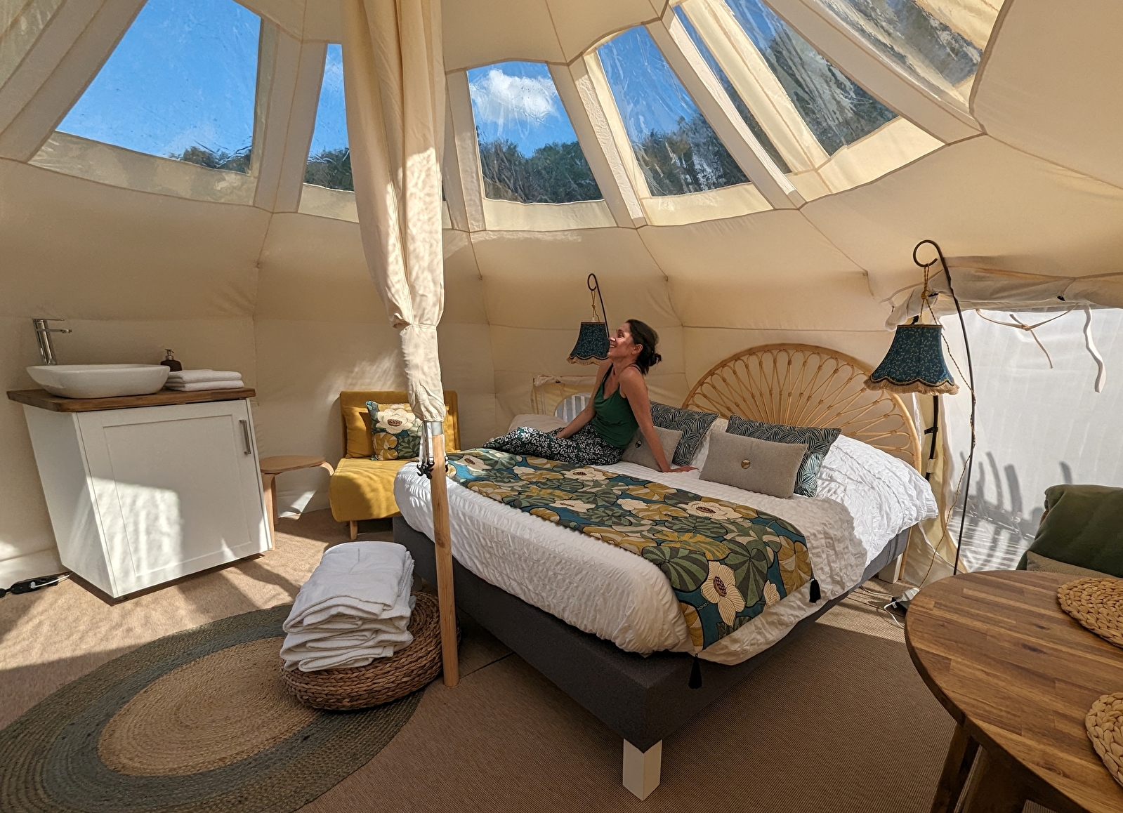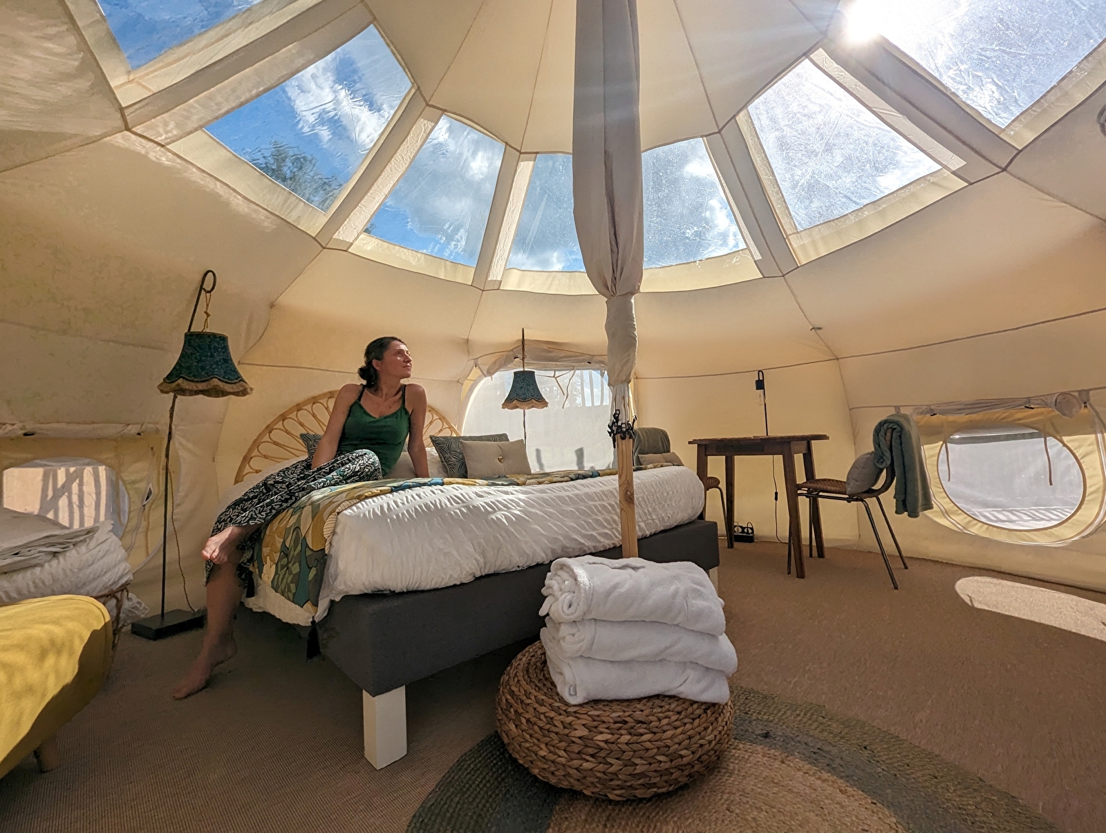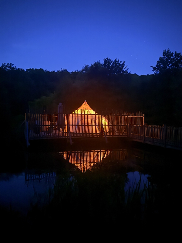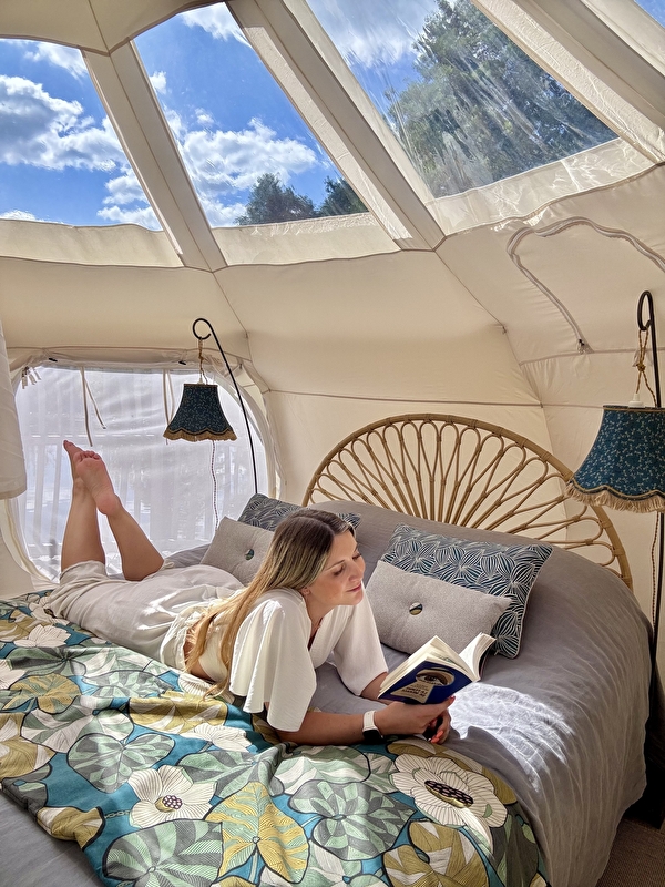 Sur une grande plateforme flottante, accessible par un ponton, trône une tente lotus, au côté d’un bain nordique n’attendant que vous. Toute en rondeur, ce cocon offre un espace repas et une chambre. Du lit, vous pourrez observer les étoiles grâce au toit transparent mais vous pourrez aussi profiter d’une grasse matinée avec le rideau pare-soleil. Sur la terrasse, le mobilier vous invite au repos.