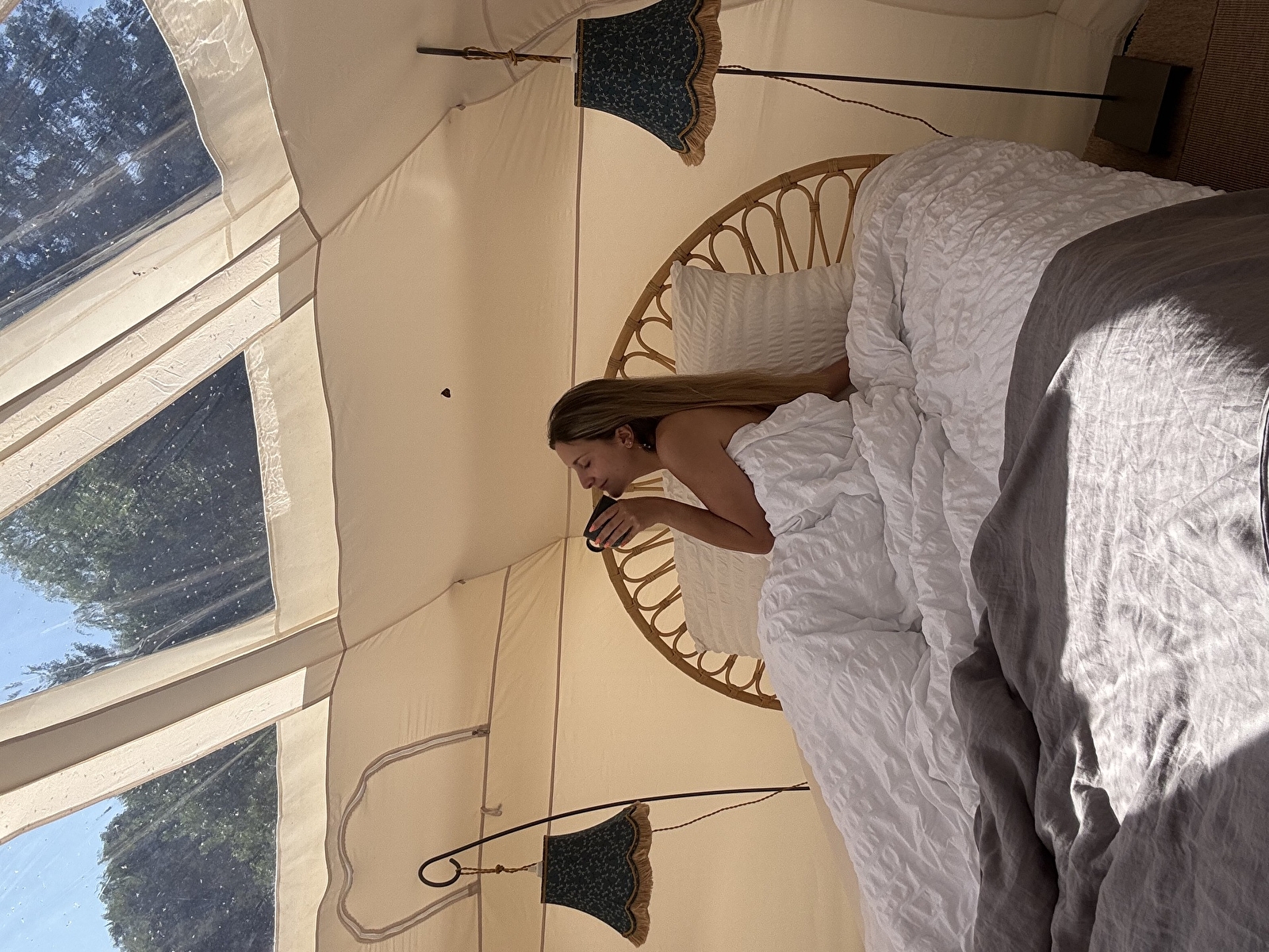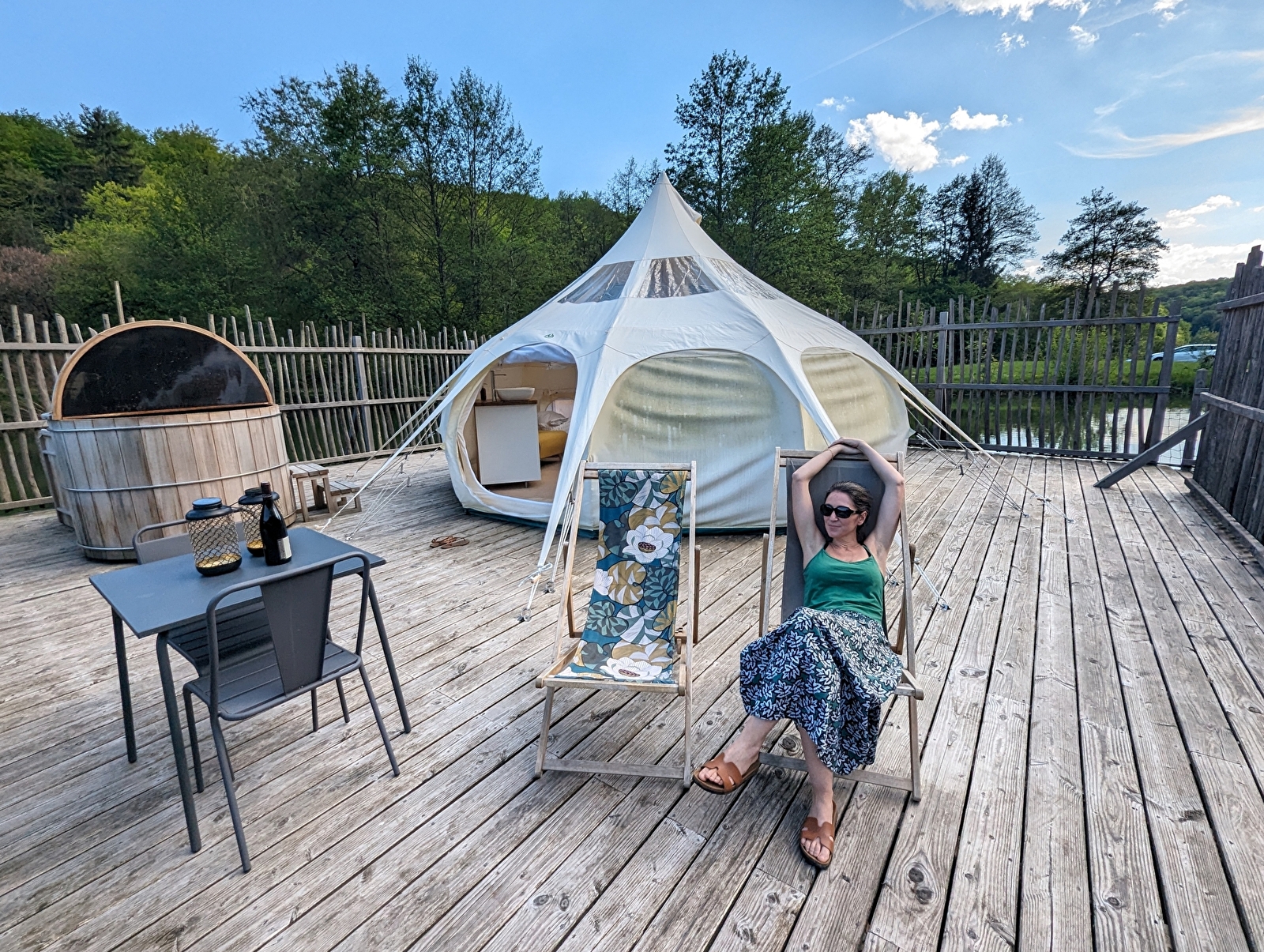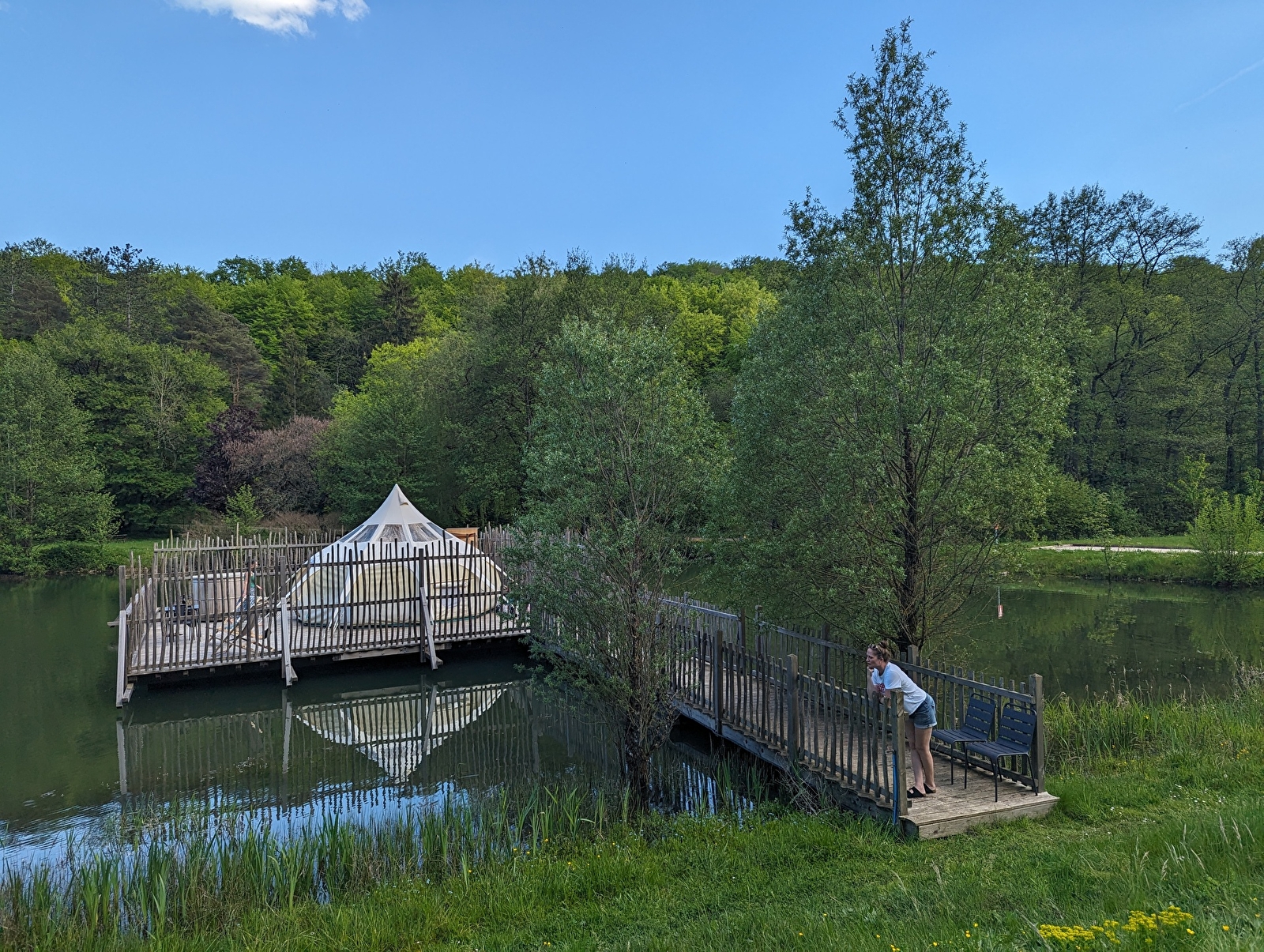 Sur une grande plateforme flottante, accessible par un ponton, trône une tente lotus, au côté d’un bain nordique n’attendant que vous. Toute en rondeur, ce cocon offre un espace repas et une chambre. Du lit, vous pourrez observer les étoiles grâce au toit transparent mais vous pourrez aussi profiter d’une grasse matinée avec le rideau pare-soleil. Sur la terrasse, le mobilier vous invite au repos.