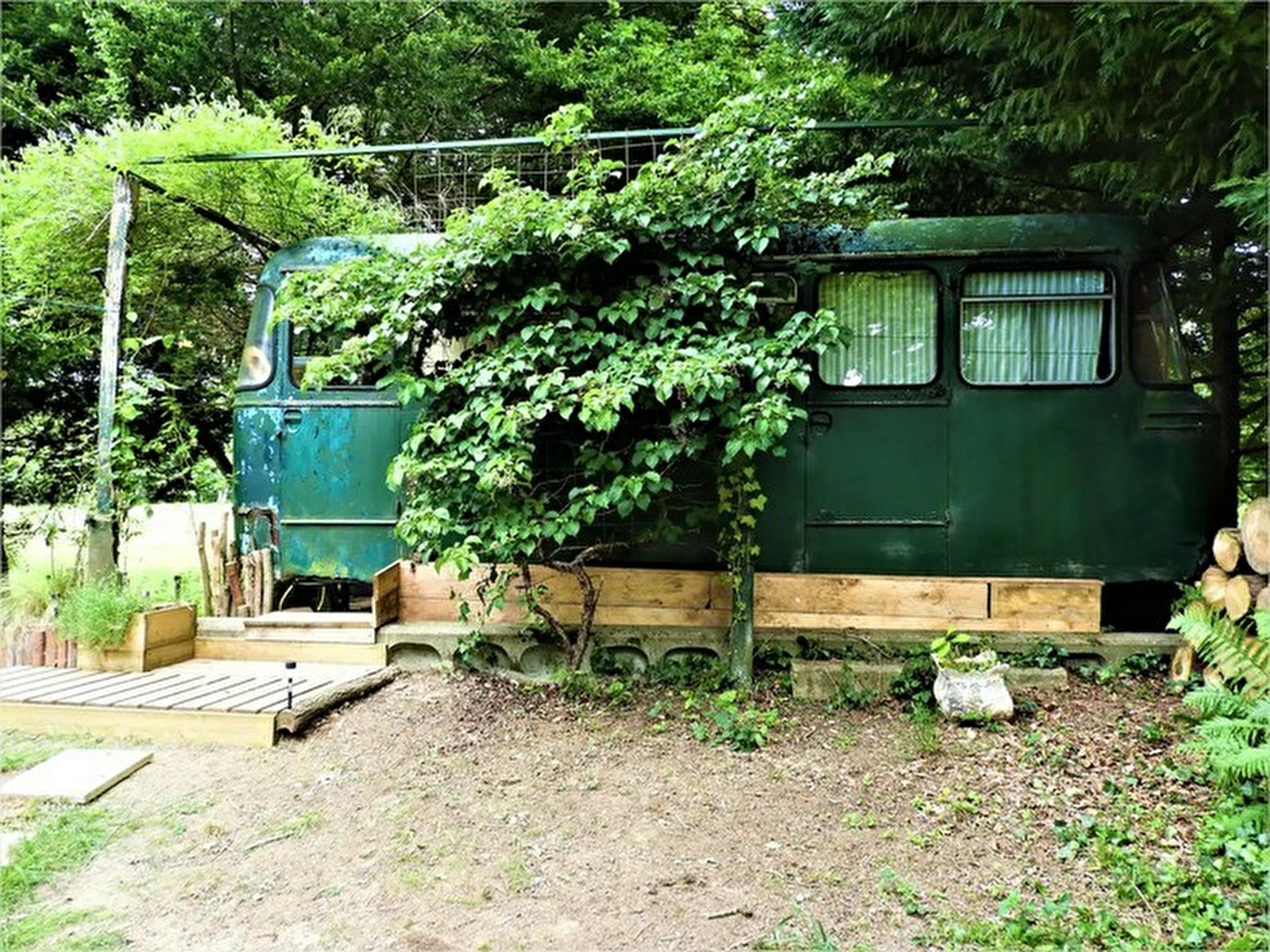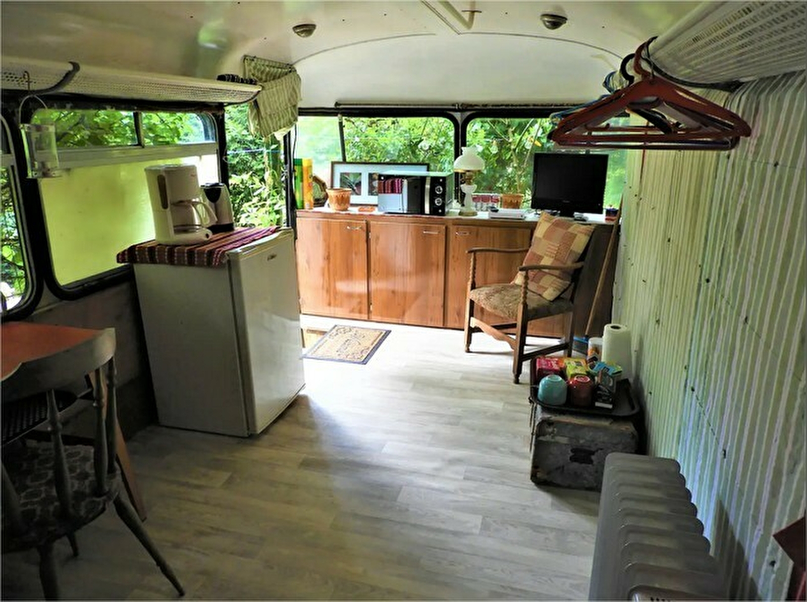Bus ("Into The Wild") réaménagé en chambre cosy. L'espace est entièrement mis à vôtre disposition et tout l'équipement nécessaire à votre confort s'y trouve. Vous disposez d'une cafetière, d'une bouilloire, d'un petit réfrigérateur, d'un chauffage électrique et d'un ventilateur. Il y a aussi un écran et son lecteur DVD (choisissez le film de votre choix) ainsi que des rangements pour vos affaires.