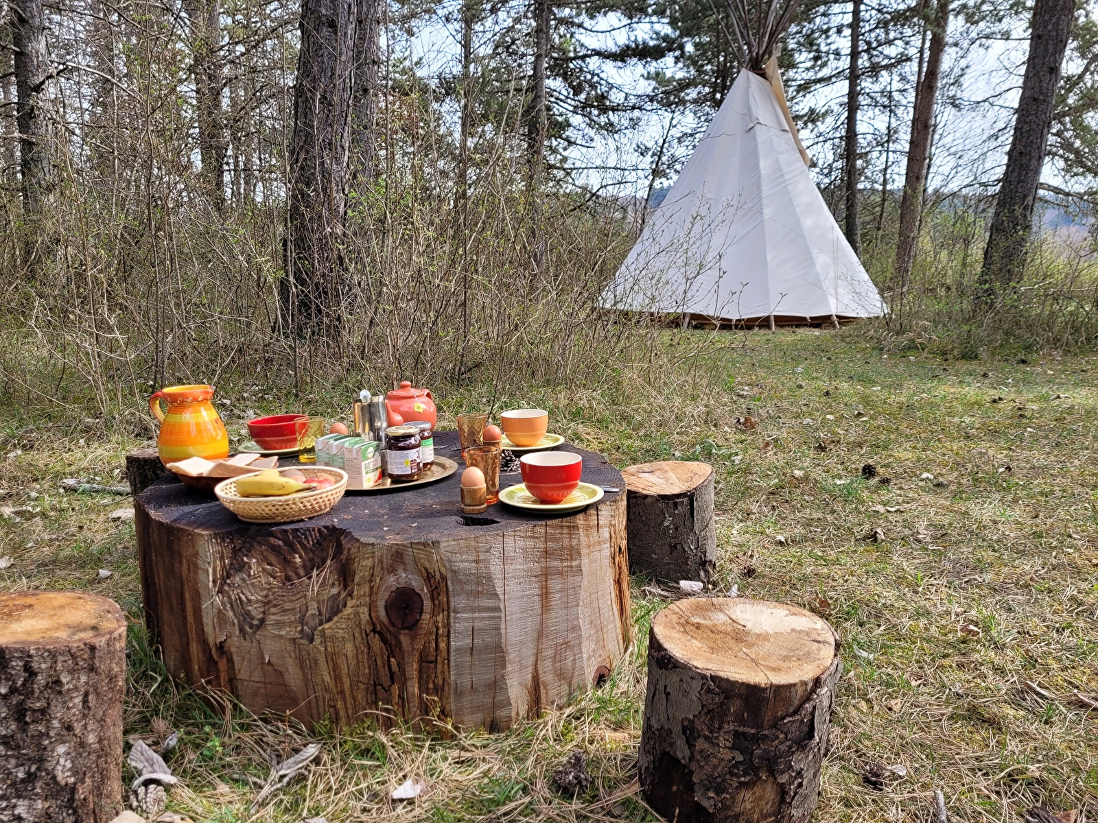 Pour ceux qui souhaitent réserver la formule "petit déjeuner", il sera en libre service dans cet espace et pourra être dégusté dans la forêt vers votre hébergement. Il est composé de produits BIO : café/thé/chocolat, jus de fruit, fruits, tartines/brioches etc... Un supplément de 8€ par personne sera facturé.