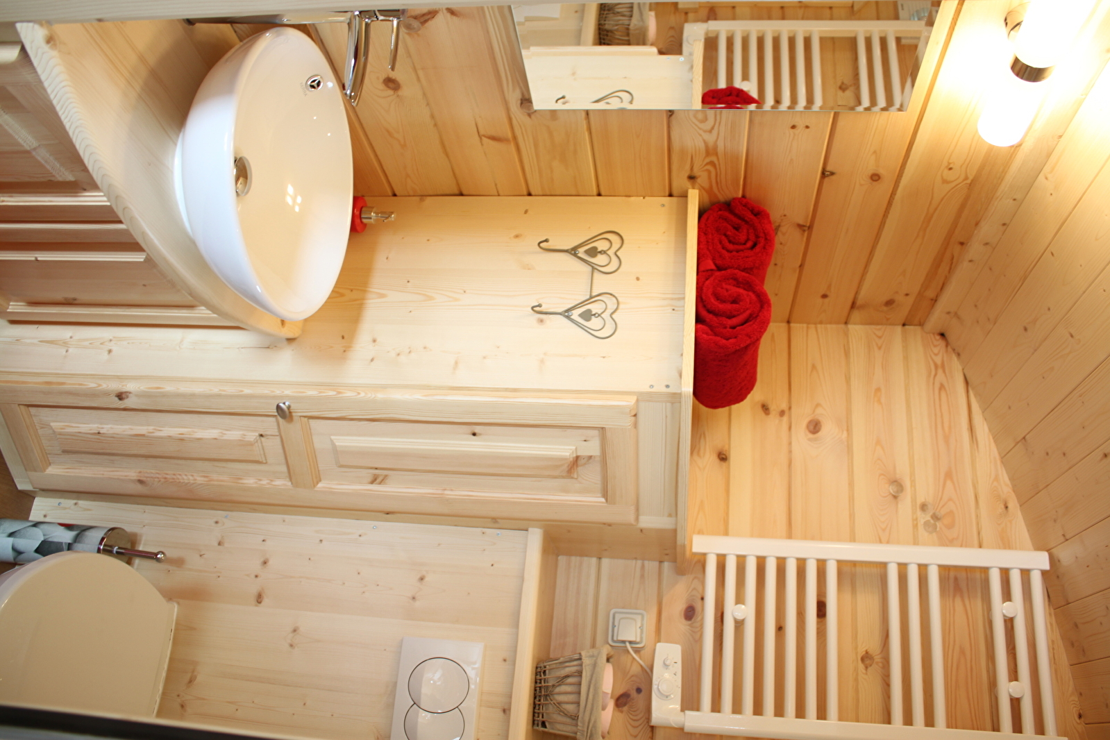 Vous trouverez dans la roulotte une salle d'eau avec une grande douche, WC suspendu et vasque, dans la pièce à vivre : 1 lit 160 cm, 1 banquette lit, une cuisine avec plaques, M.O., cafetière, bouilloire, toute la vaisselle ; TV, climatisation réversible.