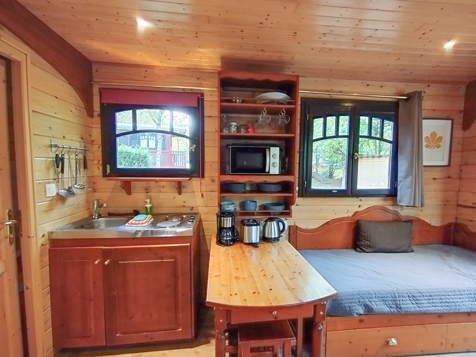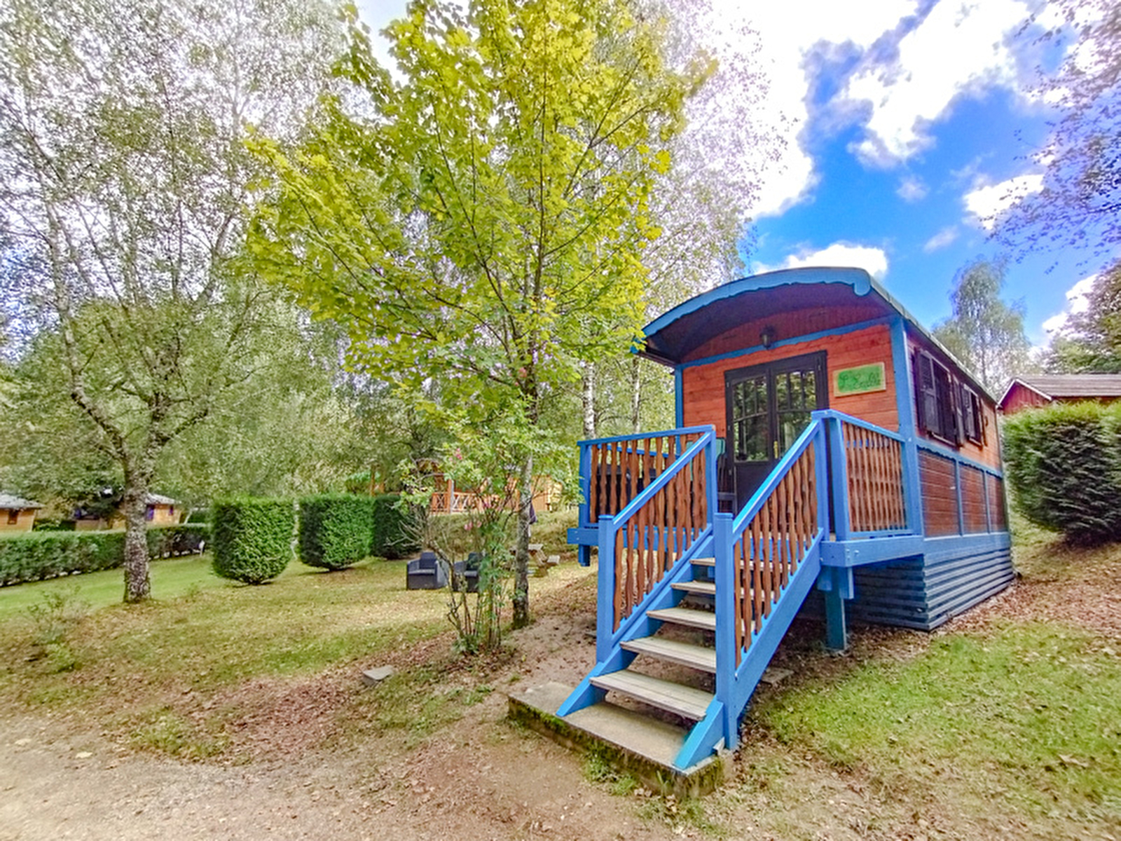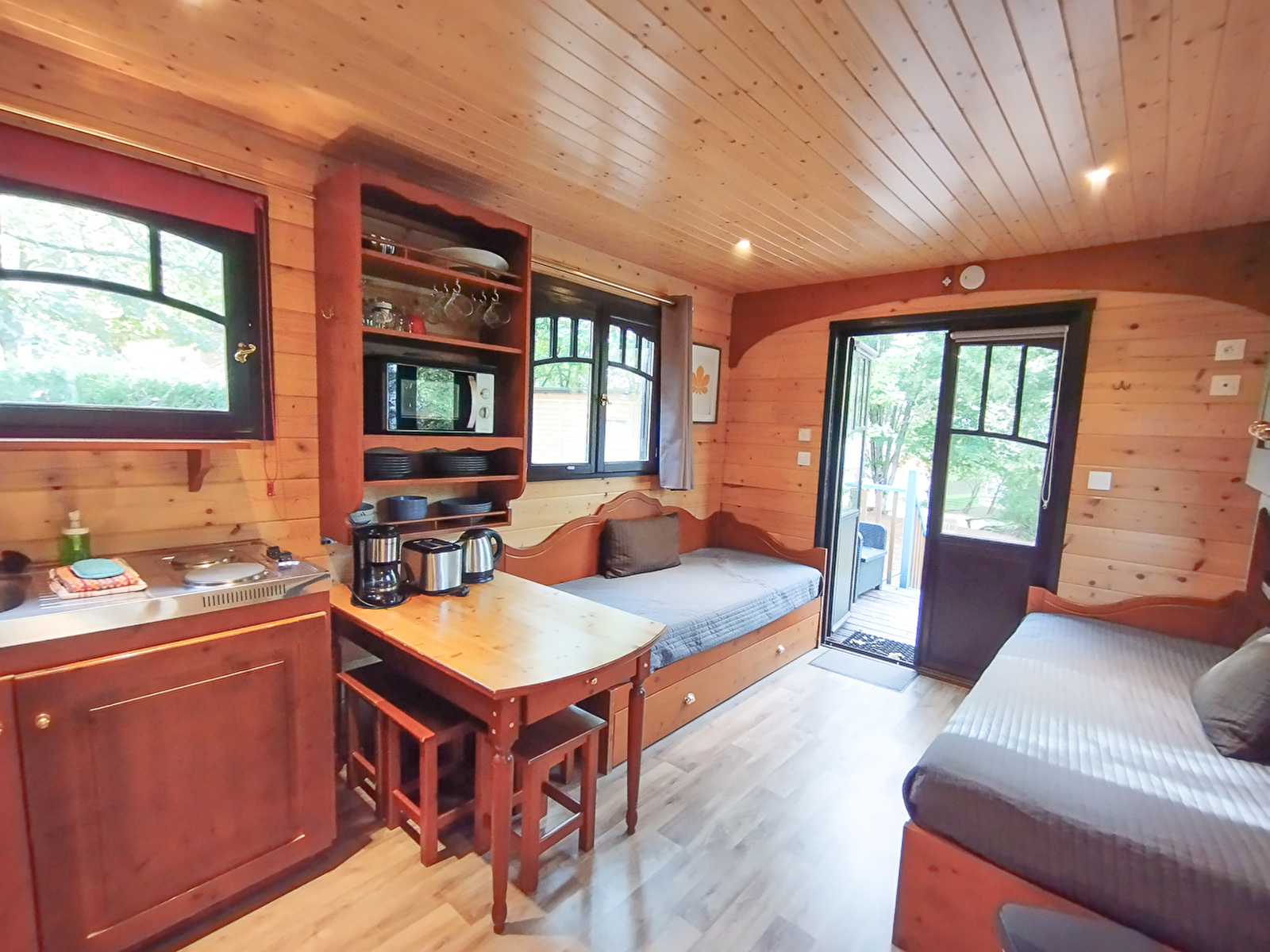 Charmante roulotte tout confort couleur ciel et entièrement équipée pouvant accueillir jusqu'à 4 personnes, composée d'un balcon avec une superbe vue dégagée sur le lac des Settons, deux lits-divans avec tiroirs de rangement de chaque côté de l'entrée, une table avec tabourets, coin cuisine avec nombreux rangements, adorable salle de bain/ toilette avec hublot et un lit 140/200 en alcôve. Belle terrasse aménagée idéale pour les apéros !