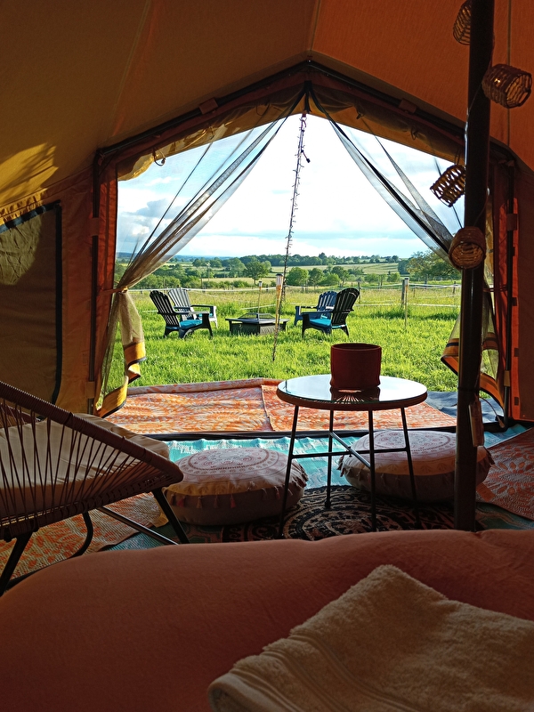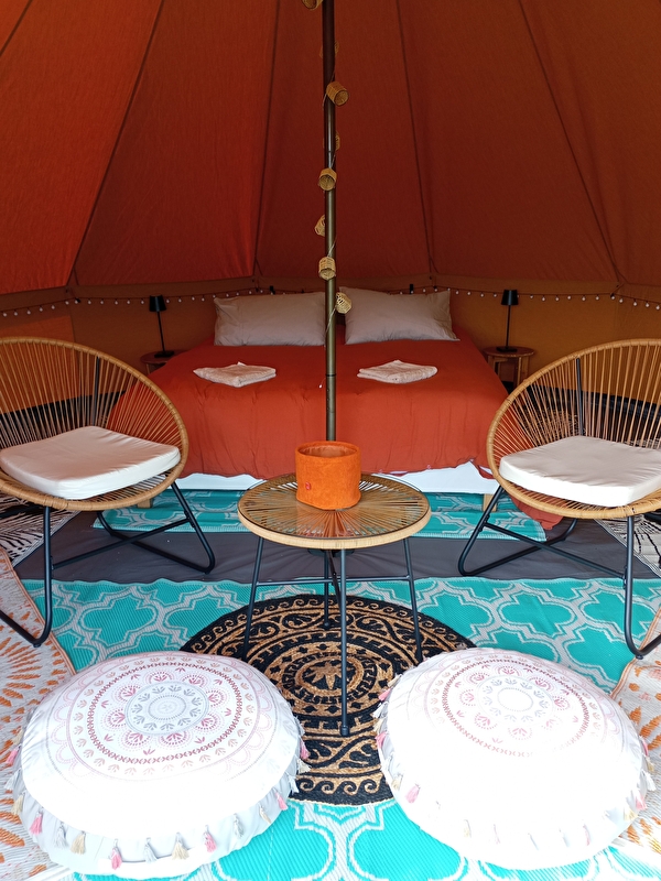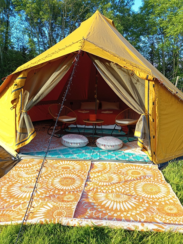 Située au cœur des paysages verdoyants de la Bourgogne, notre tente cloche de 20m² vous invite à une expérience inédite entre confort et nature. Installée en plein milieu des prés où paissent tranquillement les chevaux, elle offre un cadre idyllique pour une escapade reposante et ressourçant.