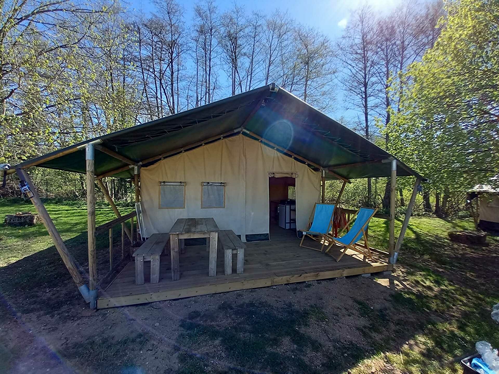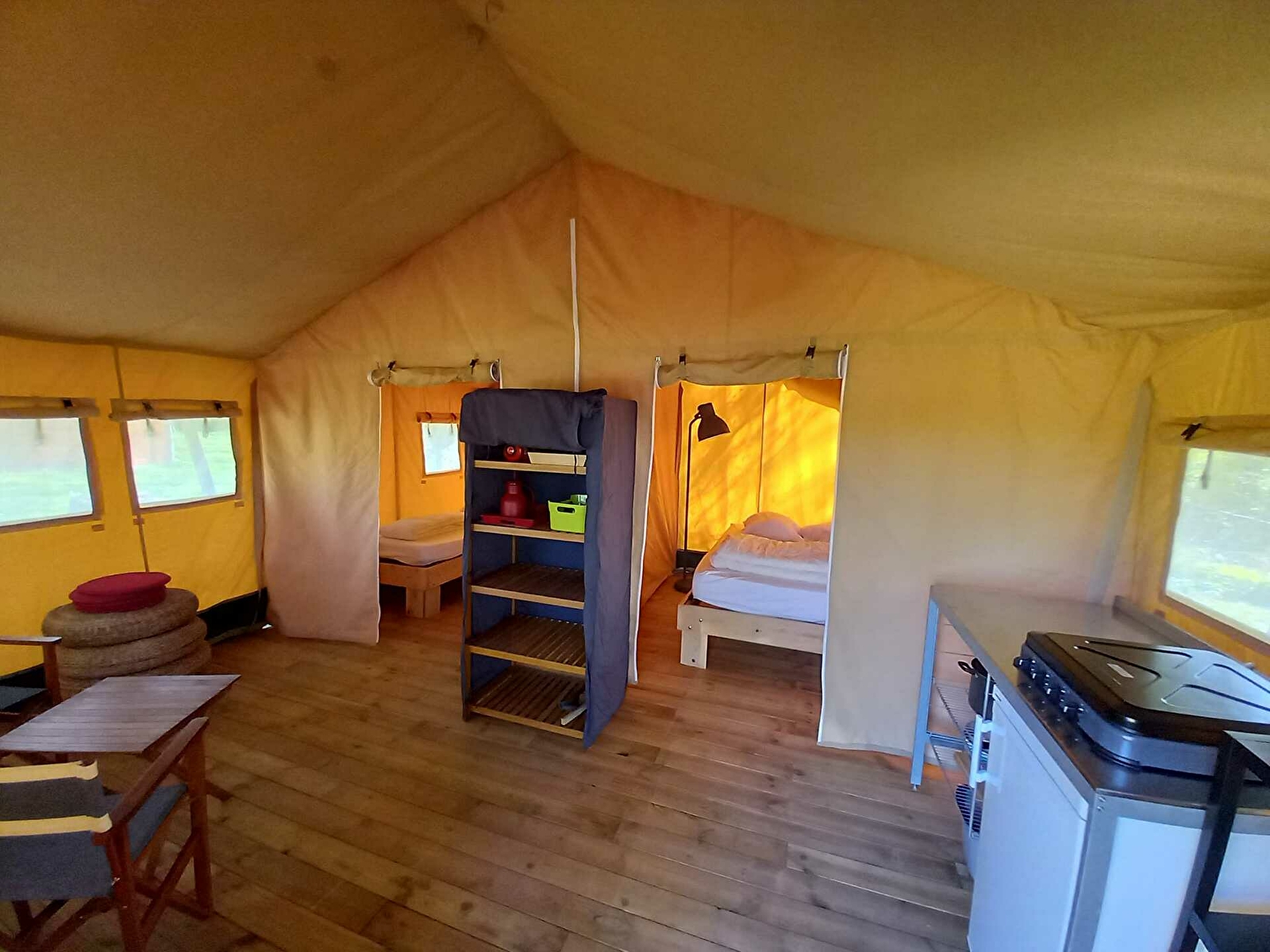 La tente Safari accueille 5 personnes, 1 chambre avec lit double et 1 chambre avec des lits superposés + lit tiroir et contient un coin cuisine, coin repos à l'intérieur. Sur le terrasse abrité, vous retrouvez un joli salon d’été en vieux bois, 2 chaises confortables pour se détendre, un hamac et barbecue.