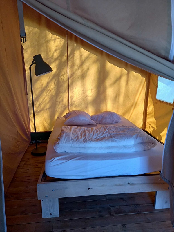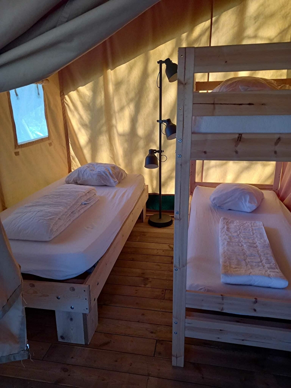 Les tentes sont posées sur une terrasse en bois de 12,5 m2 avec une tente intérieure de 25 m2 composée de deux zones indépendantes.