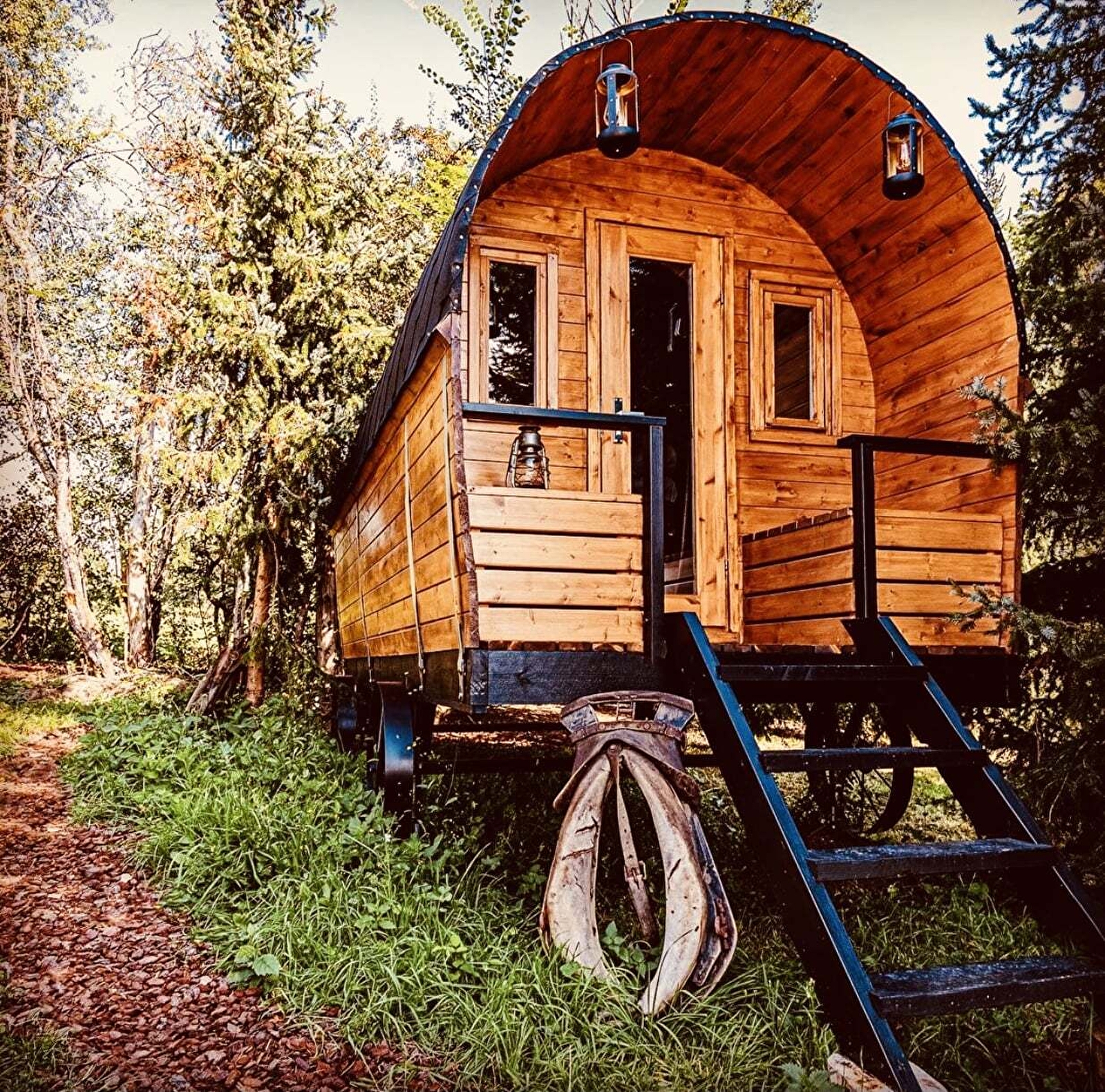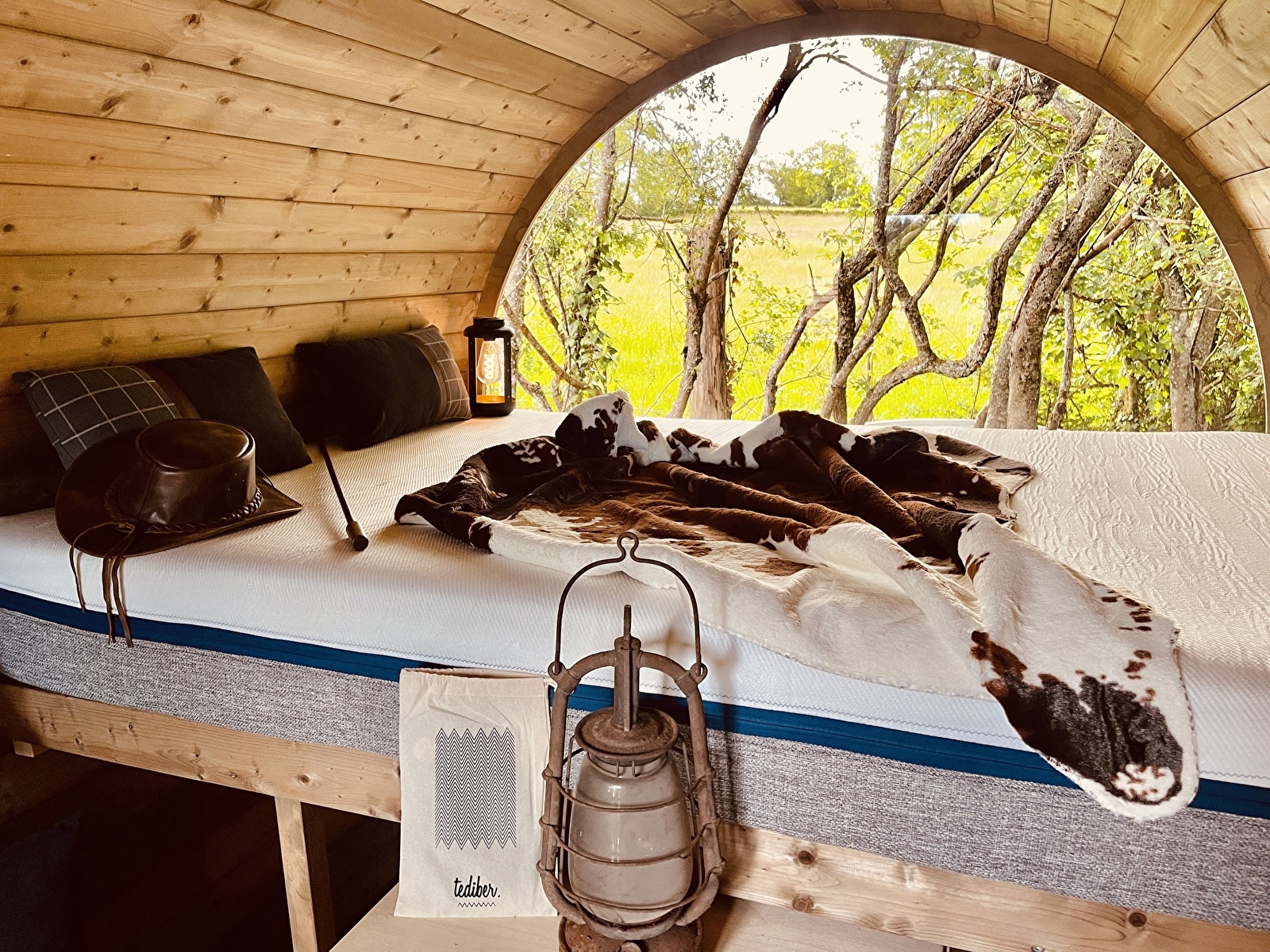 Inspiré de la conquête de l'Ouest et du rêve américain, Wild West vous fera voyager à bord de cette roulotte "Prairie Schooner revisitée". Immergez-vous au cœur de ce petit ranch ou vous pourrez vous promener au milieu des poules, vous prélasser dans votre spa en contemplant la prairie une flute de champagne à la main. Endormez-vous doucement, le regard tourné vers les champs grâce à la grande vitre qui borde votre lit.