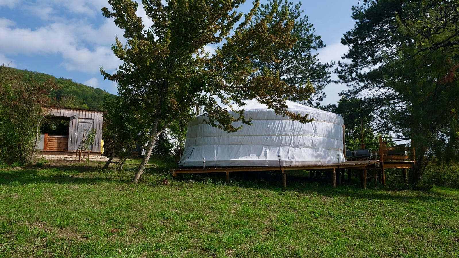 Tout proche de la yourte, vous trouverez un espace sanitaire avec une douche, un lavabo et une toilette sèche.