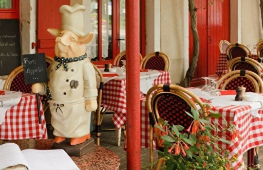 Vous reconnaîtrez ce superbe restaurant à ses jolis petits volets rouges, sa terrasse ombragée entourée de vignes. Ici on se régale : escargots, foie gras, falafels, thon cuit, suprême de volaille ou côte de porc... Il y en a pour tous les goûts !