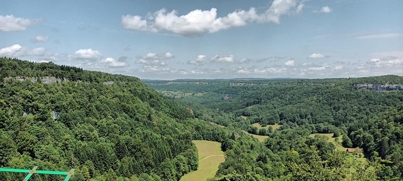 Depuis Cléron, l'itinéraire suit les traces du tacot empruntant le viaduc de l'ancienne voie ferrée. Par la suite, la boucle monte en direction du village d'Amondans. Le chemin quitte les pentes du vallon de la Mée et passe devant le château de Fertans. L'itinéraire traverse Amancey puis rejoint la source de Comboyer sur le chemin menant au belvédère de Norvaux. La boucle continue à travers la forêt et commence à longer la bordure Est de la reculée de Norvaux. Sur le chemin du retour, le belvédère du Rocher du Moine offre une vue remarquable sur la reculée. La fin de l'itinéraire se fait sous couvert forestier avant de rejoindre la petite route descendant à Cléron.