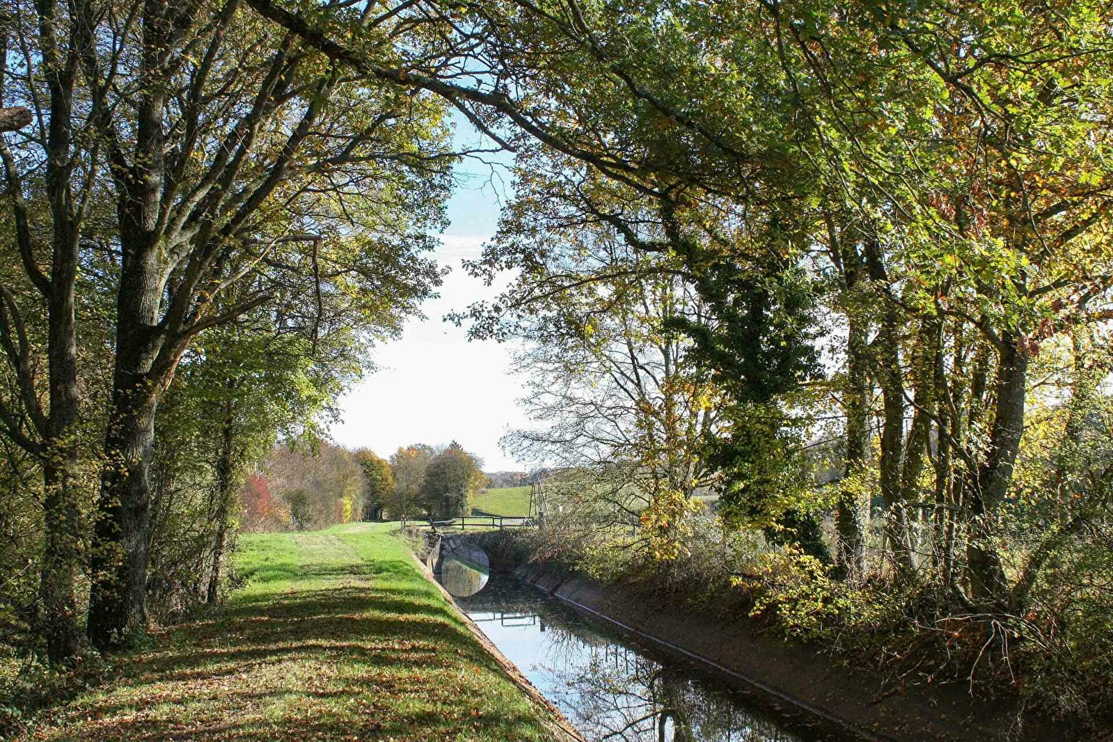 (7) Traverser tout droit au carrefour et descendre en face en suivant le fléchage routier "Le Moulin de Camerolle". Laisser filer un chemin sur la droite, passer sur le pont qui franchit la Rigole de Saint-Privé.
