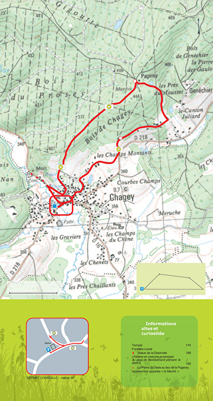 Le circuit prend son départ à la mairie, à côté du menhir en fonte, témoignage d'un pays qui, jusqu'en 1883, vibrait au rythme de ses forges. Imprégné d'un particularisme religieux où temple et église se côtoient, le circuit tire son nom d'une femme protestante portant le diairi (coiffe délicatement ouvragé). Figure emblématique du Pays de Montbéliard, la diaichotte est représentée par une remarquable statue à l'extrémité ouest du village. Le tracé nous emmène dans le bois en contre-haut du village où il s'étire pour atteindre la ligne de crête. A mi-chemin au bout d'une belle allée de feuillus vient une sapinière avec en son cour une jolie clairière où comme surgie d'un conte pour enfant on découvre une mignonne maison forestière comme une maison de poupée. Bienvenu au Pagerey, ancien hameau dont ne subsiste que cette maisonnette.