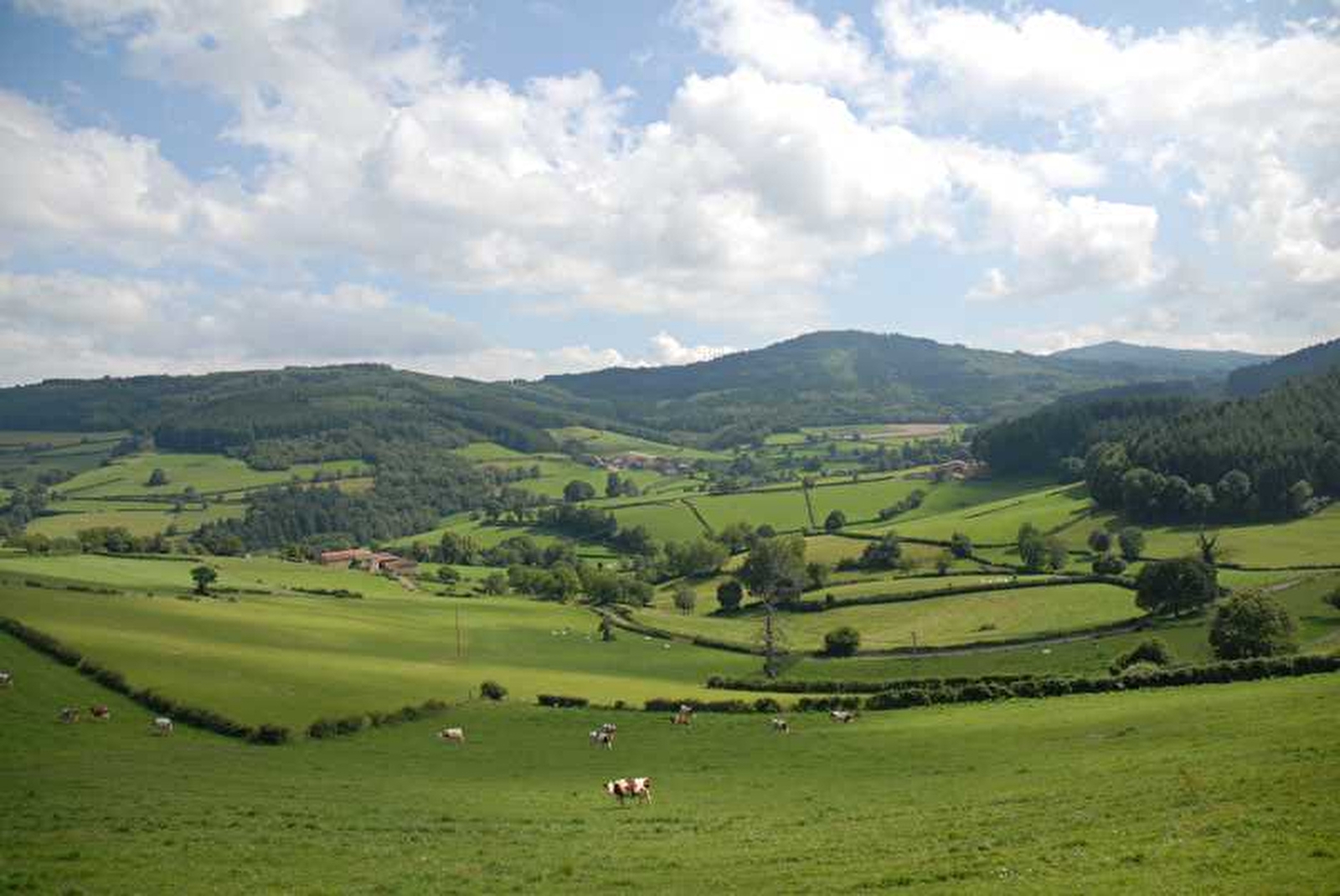 Entouré de vertes collines, les paysages autour de Saint Bonnet des Bruyères offrent plus de pâturages au regard que de forêts de Douglas.