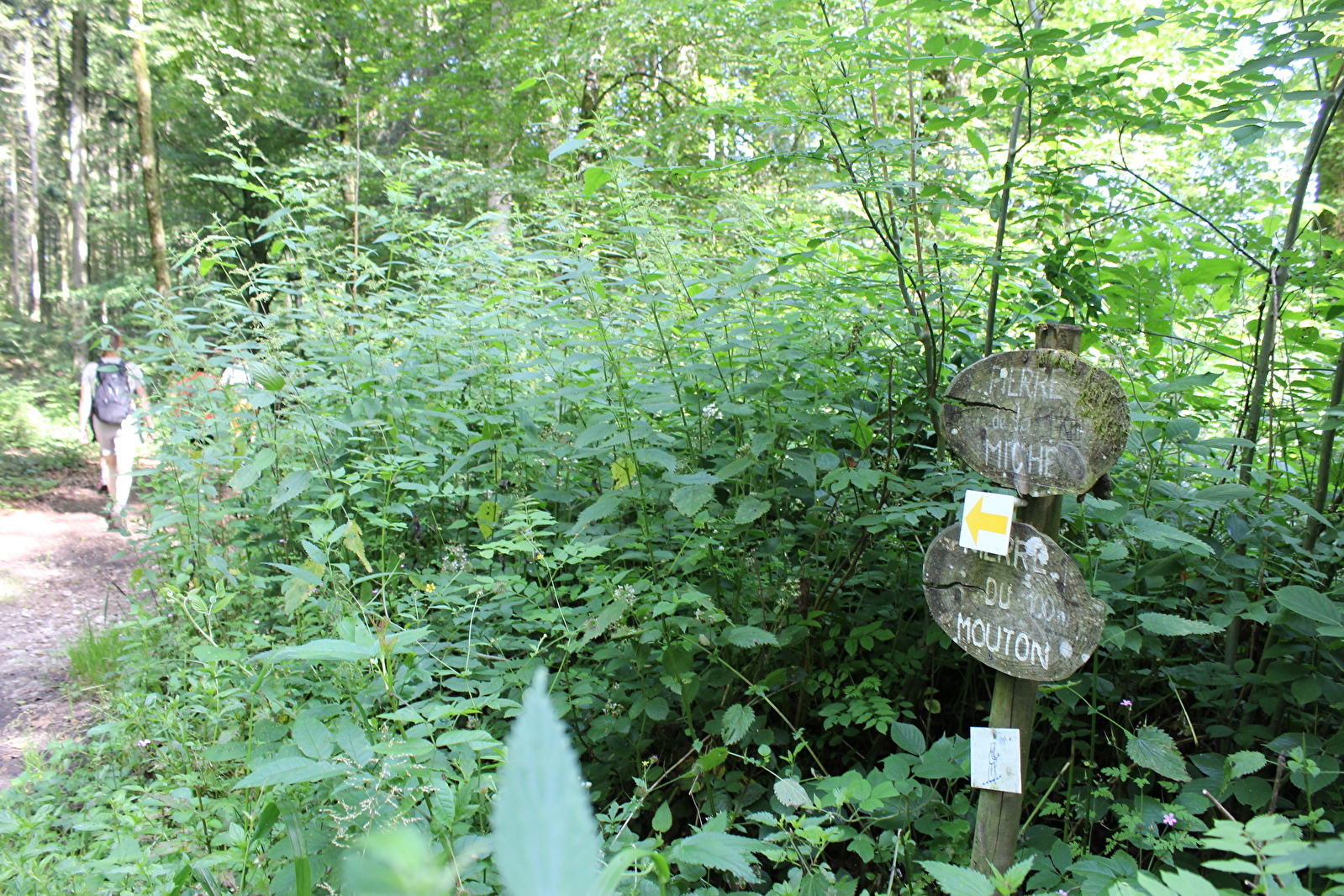 Sur votre droite, à 50 m du chemin se trouve la Pierre du mouton. Ce bloc de 80 cm de haut possède des inscriptions ainsi que de grandes balafres. Selon la légende, des béliers étaient jetés et tués contre cette pierre. Revenez sur vos pas et prenez le sentier en face qui vous mène à la Pierre de la Miche.