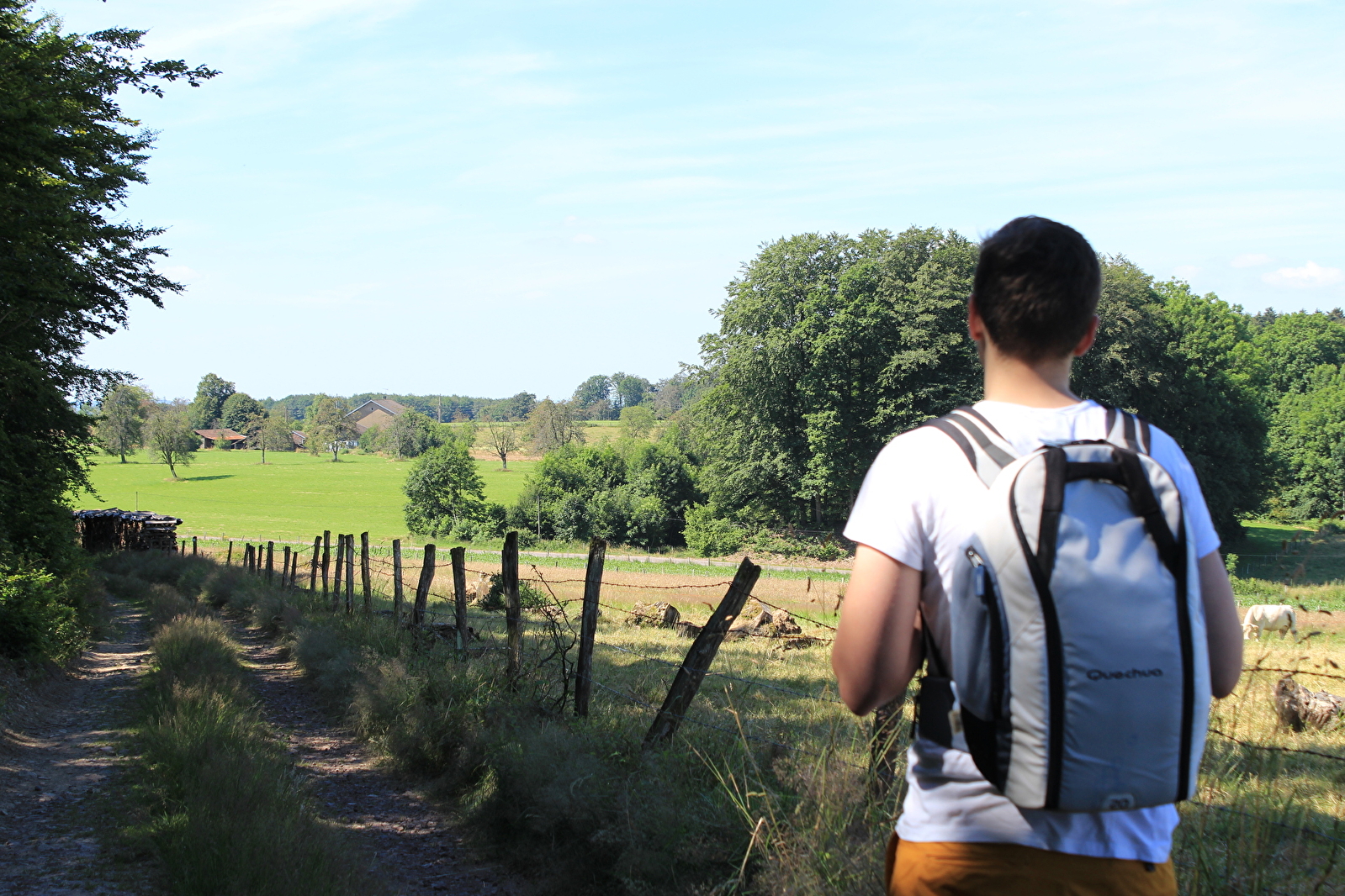 Sur cette pierre, on peut deviner 3 empreintes : celle d’une miche, d’une bouteille et d’un pied. D’après la tradition locale, saint Colomban y aurait pris sa collation. Prenez le sentier à gauche qui vous emmène jusqu’à l’Étang de la Rémolure. Suivez la digue et poursuivez votre chemin jusqu’à retomber sur une route goudronnée. Tournez à droite en direction de l’ancienne lavière. Avant d’arriver au hameau Les Forges, prenez le sentier qui remonte sur votre gauche et qui vous mène jusqu’au lieu-dit de la Grosse Grange.