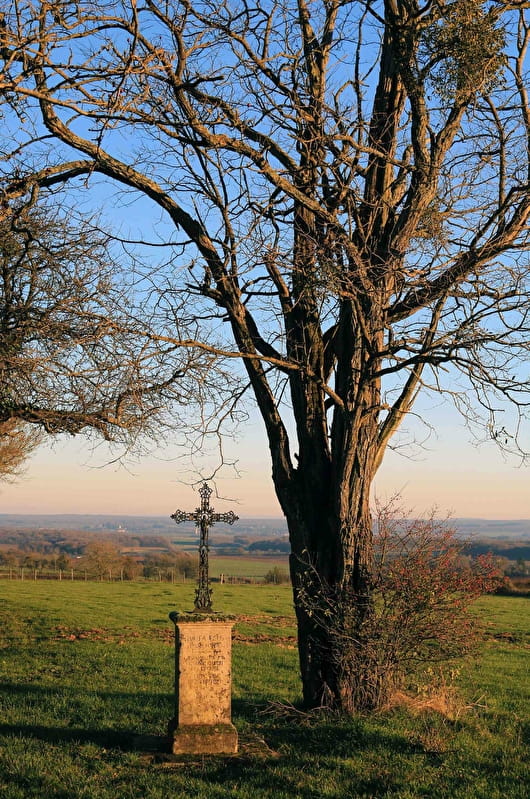(7) Au 1er croisement avec le calvaire, laisser le chemin et prendre à gauche en direction de Bois Pille. Traverser ce hameau par la droite.