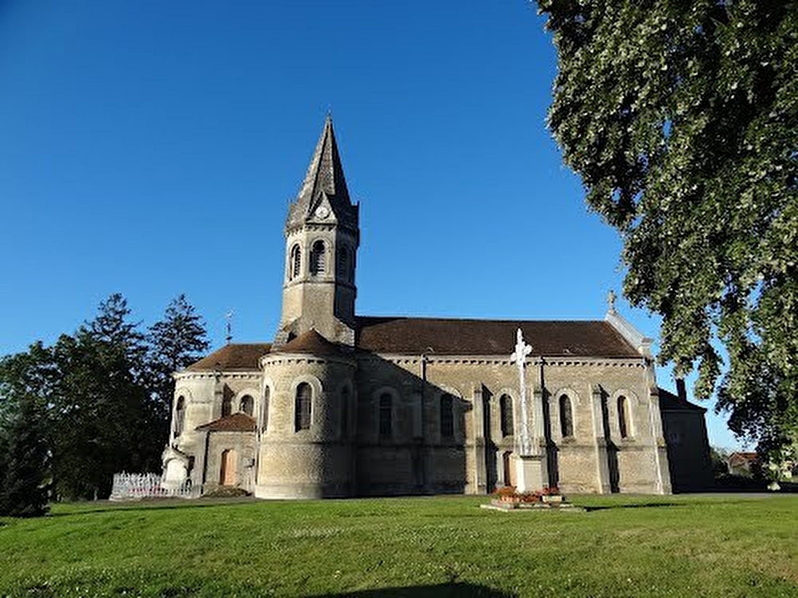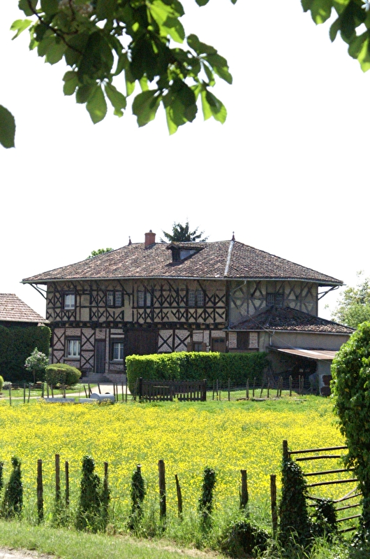 Le départ se fait à la mairie de Saint-Bénigne. L'église de Saint-Bénigne a été construite grâce à Michel Poisat (1802-1869) et sa femme, dont les tombeaux se trouvent dans cette église néo-romane. En face de l'église la maison haute et basse à pans de bois est à voir.