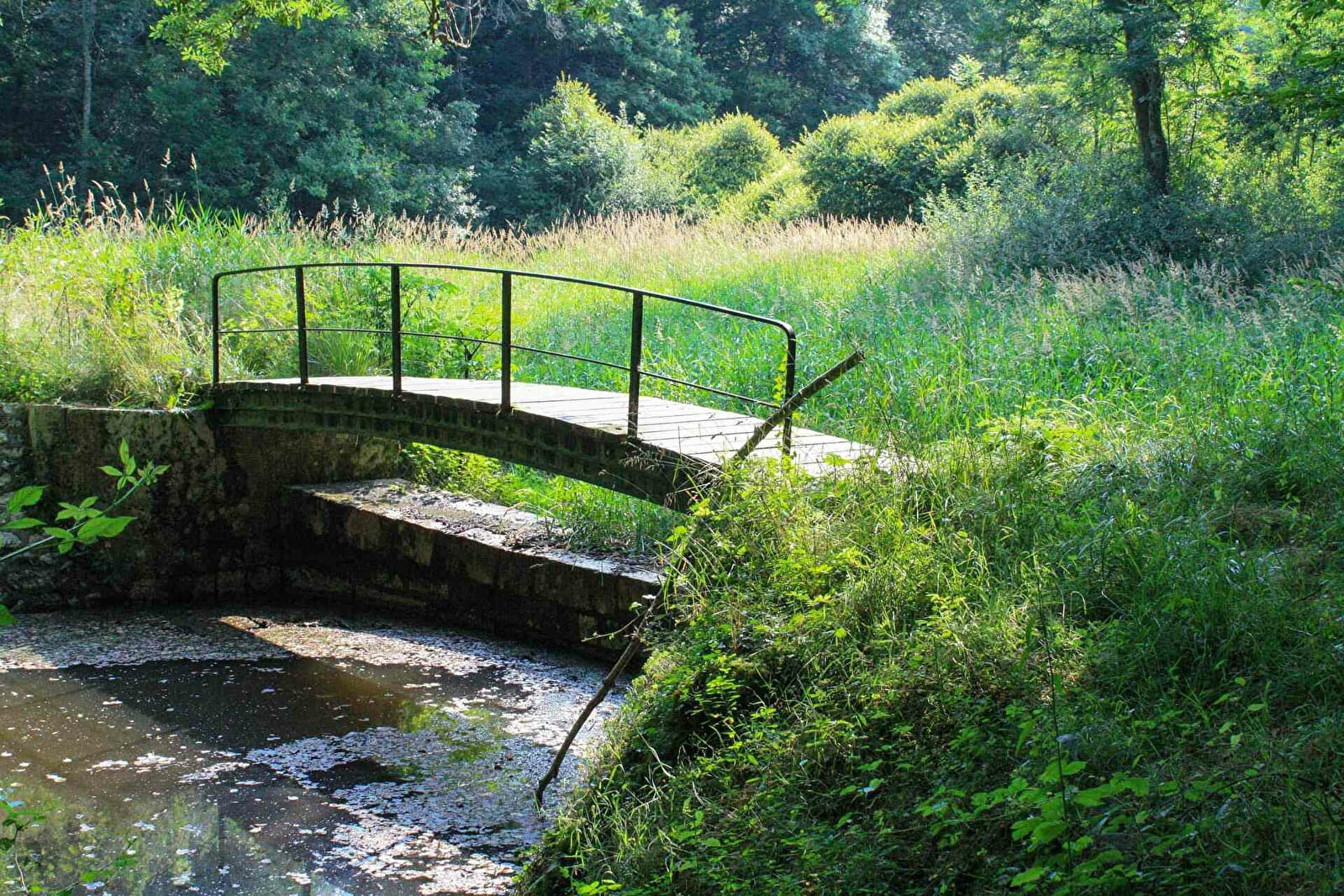 Continuer dans ces sous bois pour atteindre un carrefour de chemins de terre et un pont enjambant la rigole.