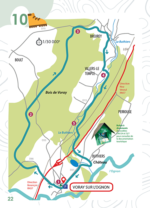 5• Franchir la LGV et la N57 en restant sur votre gauche puis rejoindre le château de Buthiers. Passé le château, prendre la petite route sur la droite qui rejoint la D31 direction Voray-sur-l’Ognon et quelques centaines de mètres plus loin, le point de départ.