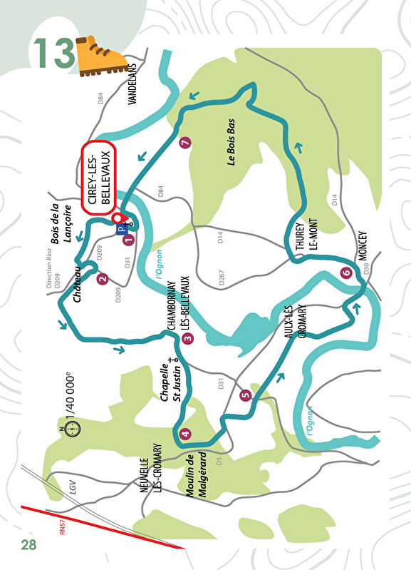 7• à la sortie du bois, continuer tout droit pour rejoindre Cirey. Franchir l’Ognon et prendre à gauche rue de l’église pour retrouver le point de départ.
