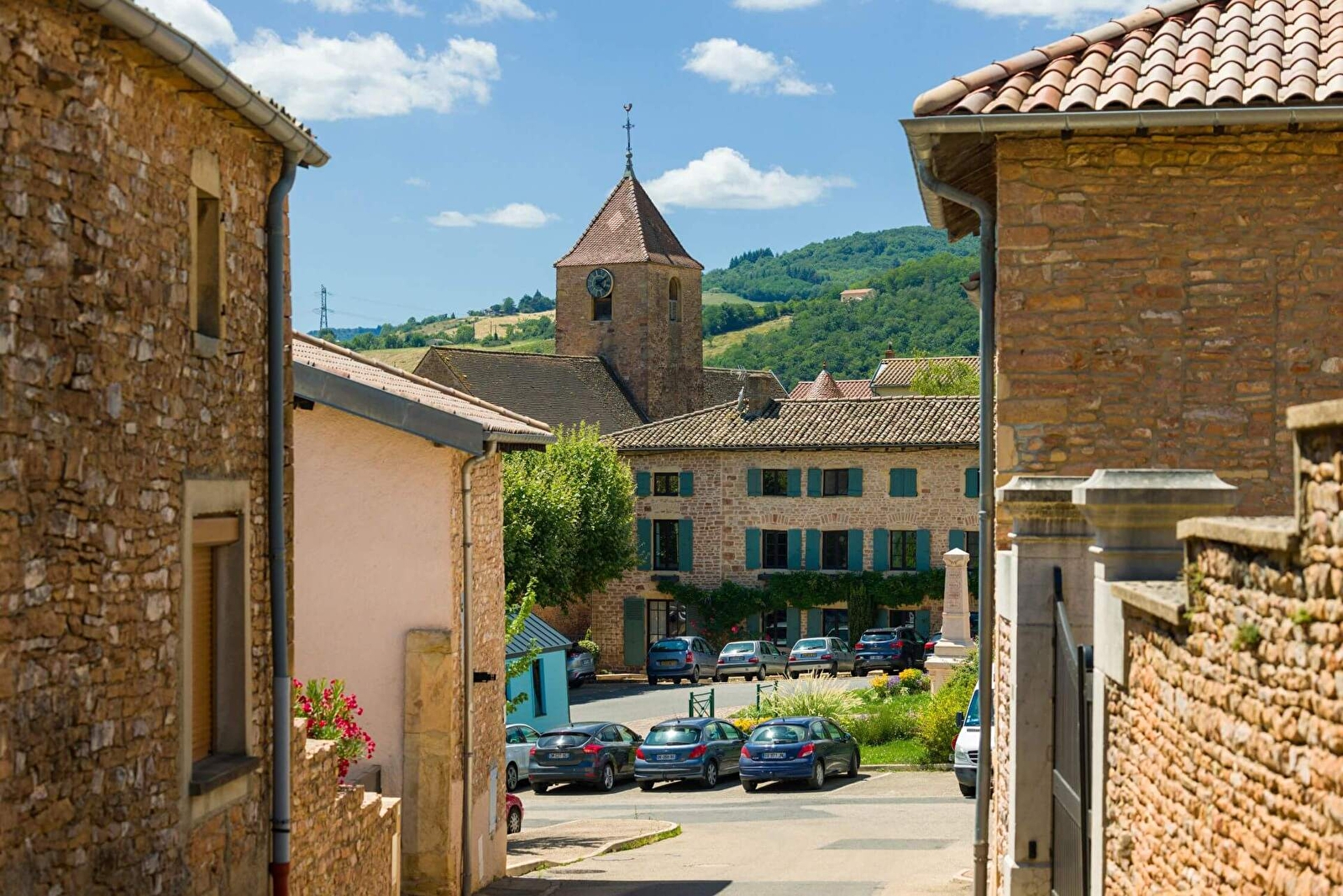Ce joli bourg, bâti en pierre rose de Bourgogne, mérite qu'on s'y attarde, qu'on prenne le temps d'une pause sur la place du village. Vivante les jours de fête avec son auberge, son terrain de pétanque bordé de platanes. Paisible le reste de l'année où seules les aiguilles du clocher nous rappellent au temps qui passe. Les ruelles, autour, réservent de belles surprises, le "Vieux Château", ancien prieuré de l'abbaye de Tournus et les œuvres de l'artiste Ted Nomad.