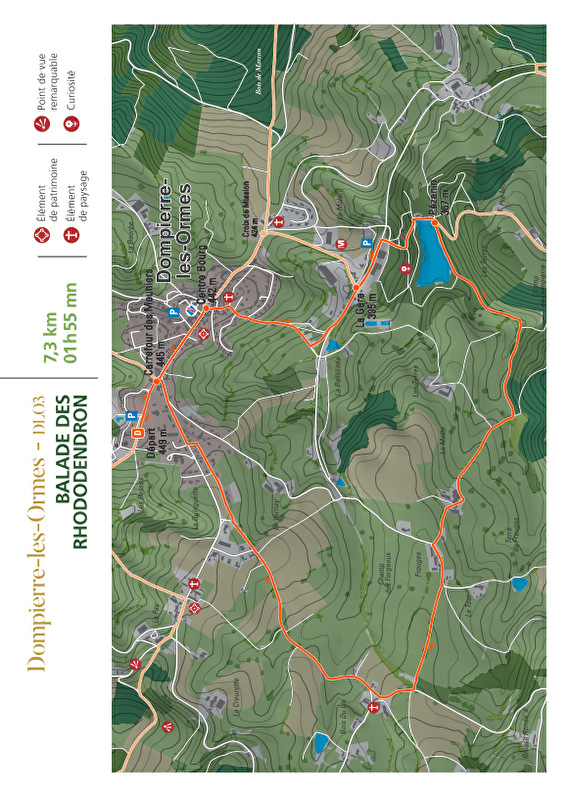 Du parking du camping des Meuniers, se diriger vers le centre de Dompierre-les-Ormes. Arriver sur la D 41 (rond-point).