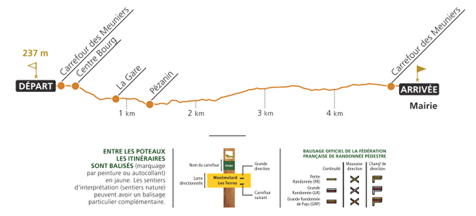 Tourner à gauche et aller en direction de l’église. Monter à droite comme pour y entrer, la contourner et prendre à droite en direction du hameau des Ormes ; descendre tout droit ; après le hameau, le chemin plonge vers l’ancienne voie ferrée.