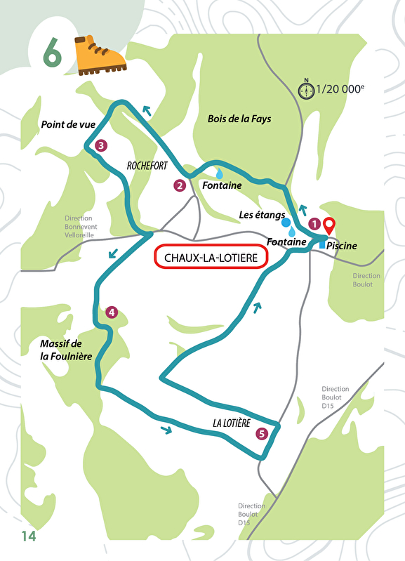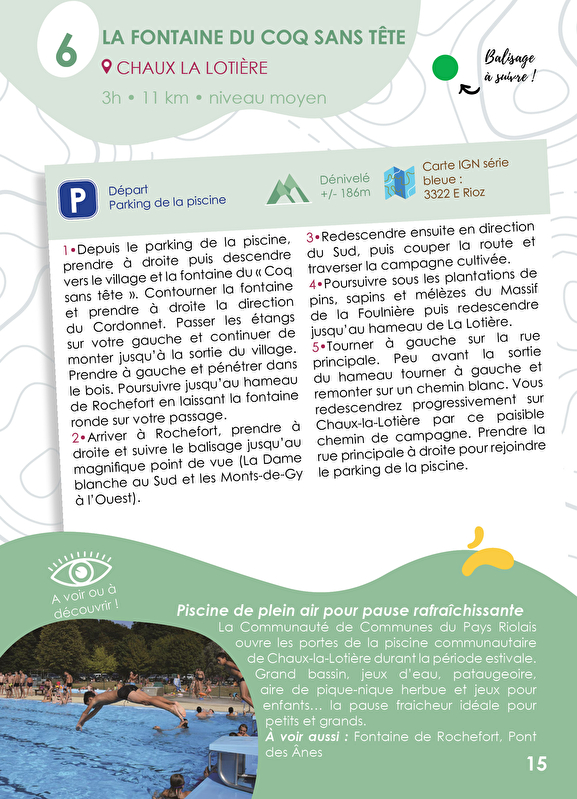 1•Depuis le parking de la piscine, prendre à droite puis descendre vers le village et la fontaine du « Coq sans tête ». Contourner la fontaine et prendre à droite la direction du Cordonnet. Passer les étangs sur votre gauche et continuer de monter jusqu’à la sortie du village. Prendre à gauche et pénétrer dans le bois. Poursuivre jusqu’au hameau de Rochefort en laissant la fontaine ronde sur votre passage.