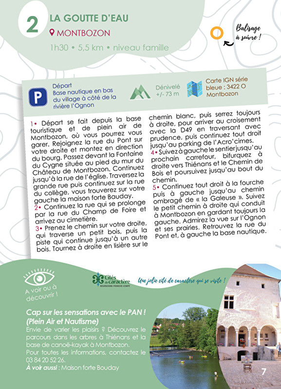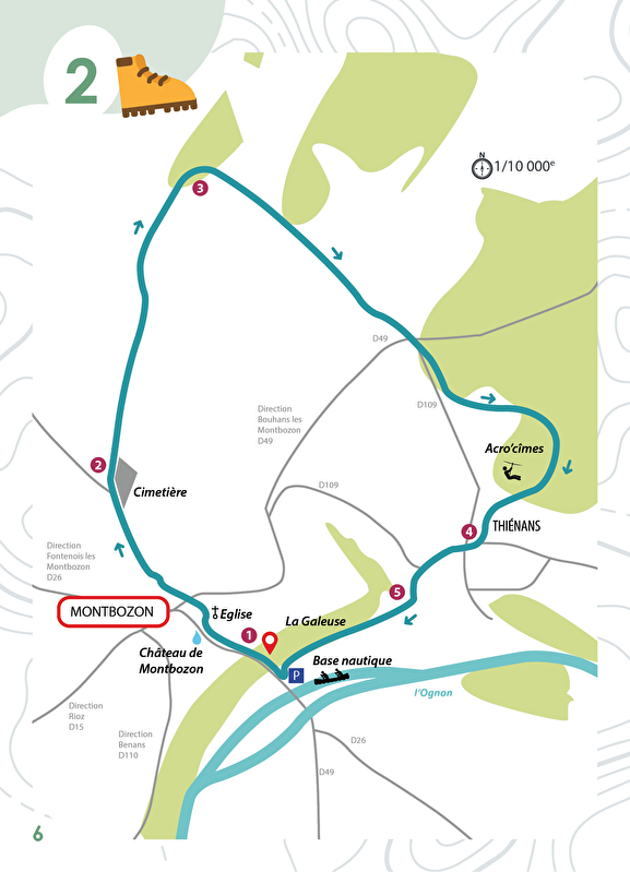 1• Départ se fait depuis la base touristique et de plein air de Montbozon, où vous pourrez vous garer. Rejoignez la rue du Pont sur votre droite et montez en direction du bourg. Passez devant la Fontaine du Cygne située au pied du mur du Château de Montbozon. Continuez jusqu’à la rue de l’église. Traversez la grande rue puis continuez sur la rue du collège, vous trouverez sur votre gauche la maison forte Bauday.
