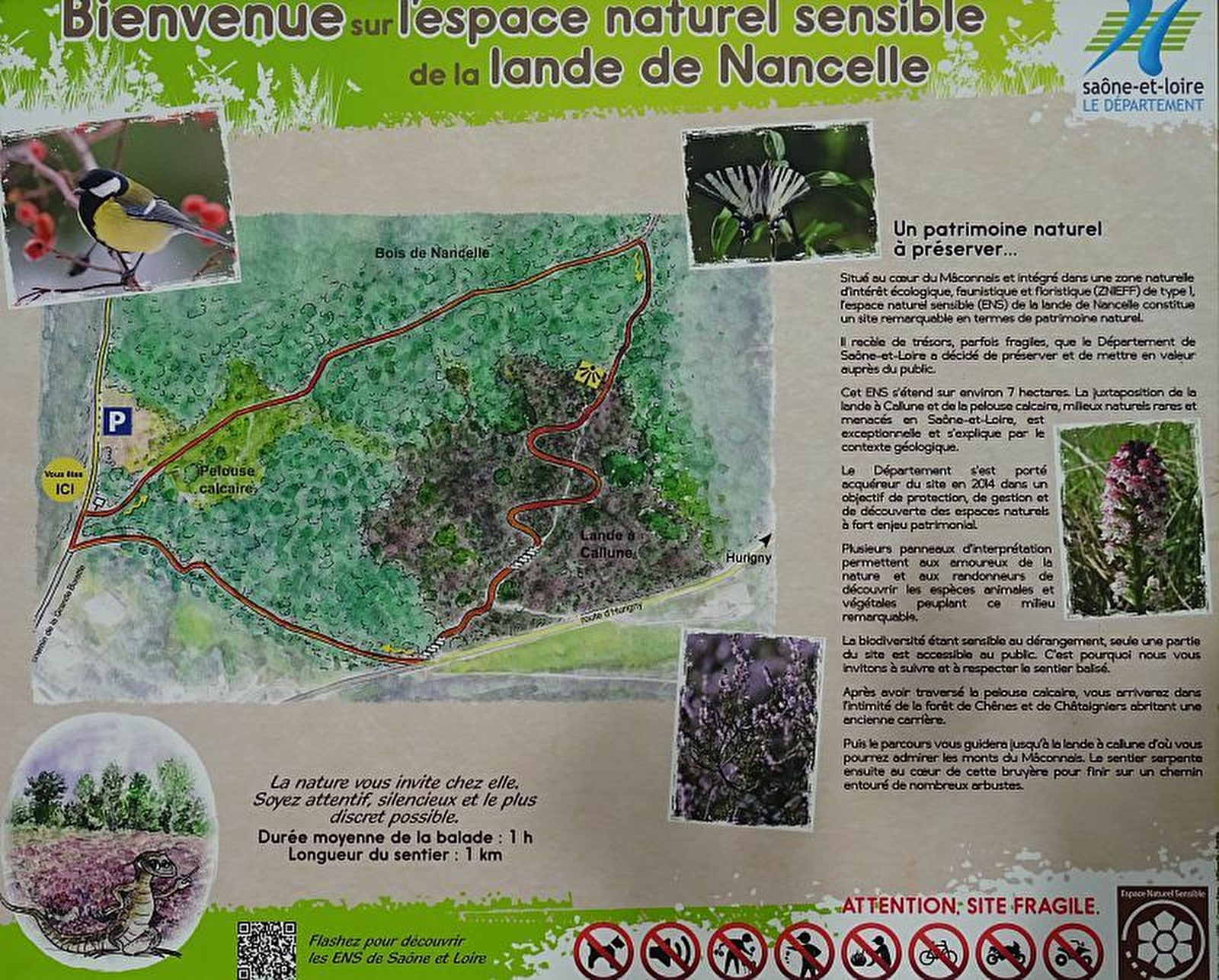 Cet espace naturel sensible recèle un milieu remarquable de pelouse calcaire, appelée aussi pelouse sèche et de lande acide (des milieux rares et menacés en Saône-et-Loire), forêt de feuillus, héritage d’un contexte géologique particulier couplé à un magnifique panorama sur les monts du Mâconnais. La lande abrite la callune appelée «bruyère commune ou fausse bruyère» (peu répandue dans la région) ; sa floraison empourpre la lande à la fin de l’été. Des panneaux d’interprétation donnent une lecture expliquée de la flore, de la faune dont l’engoulevent d’Europe, oiseau secret et de nombreuses espèces de reptiles, papillons et araignées.