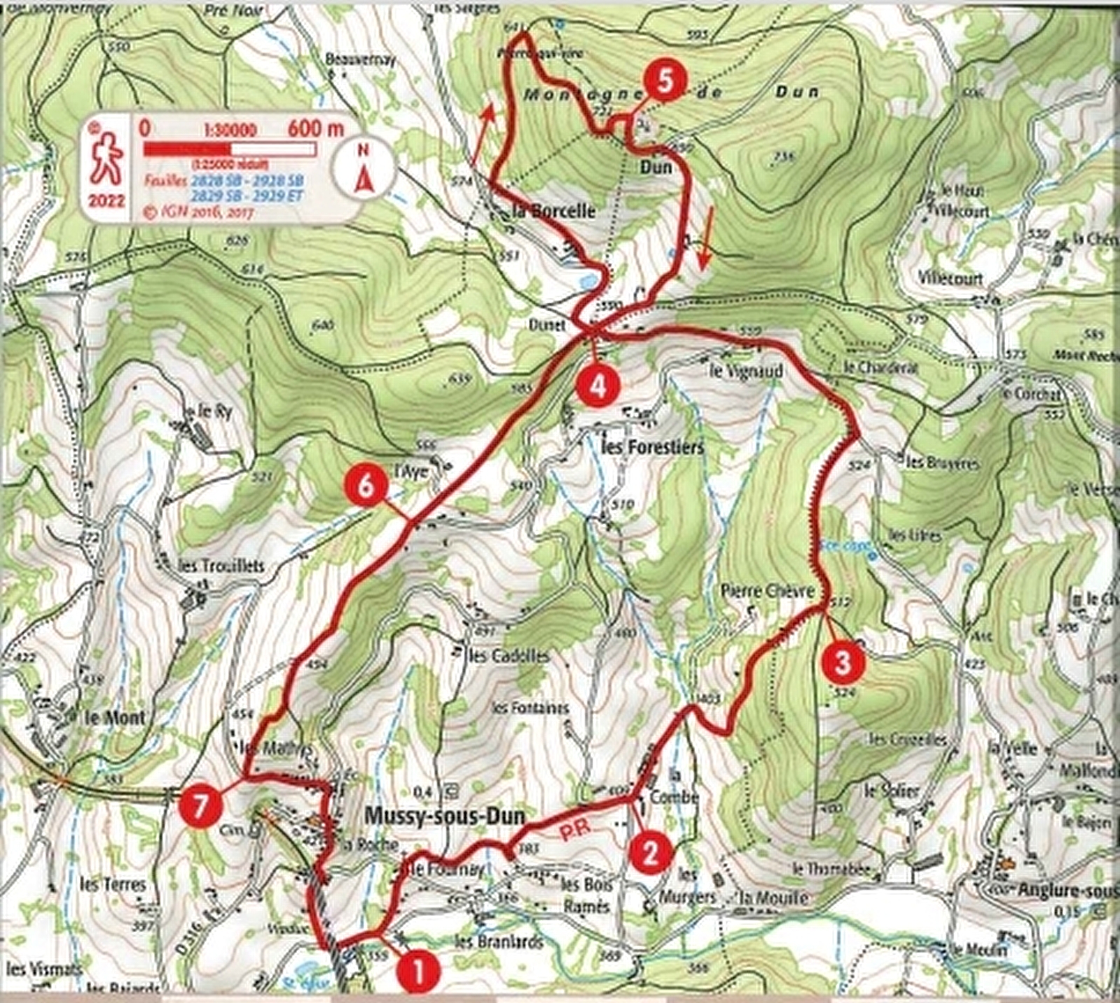 4- Au Dunet, prendre la route en face. Bifurquer à droite vers La Borcelle-du-Haut. A la croix, poursuivre par le chemin derrière la maison à droite. Après 400m, à la croisée, monter par le chemin à droite dans le bois. Virer à droite en épingle pour continuer l'ascension. Sur le replat, grimper par le sentier à gauche. Au gros sapin, aller à droite, franchir la chicane et arriver à la chapelle de Dun.