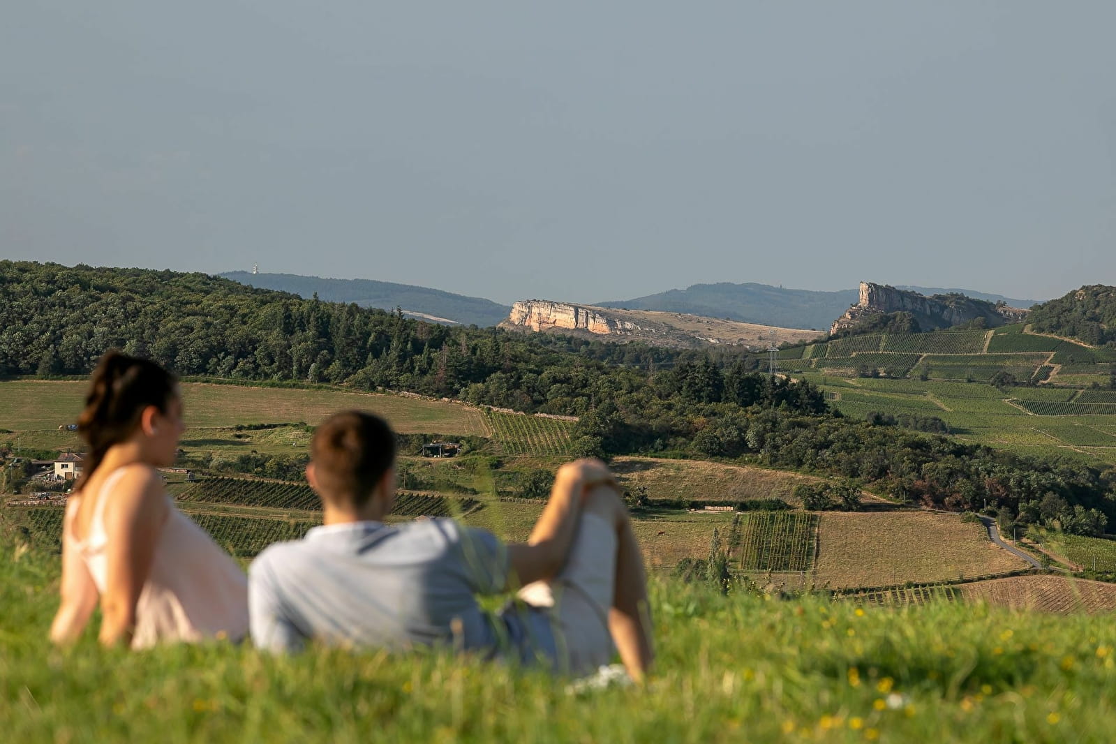 À Pruzilly, le relief devient plus marqué. Peu à peu, avec l’altitude, la vigne laisse place à un paysage où se mêlent de grandes étendues boisées et des sommets herbeux : véritables balcons ouverts sur de superbes points de vue, tout comme La Pierre Folle, bien connu des locaux.