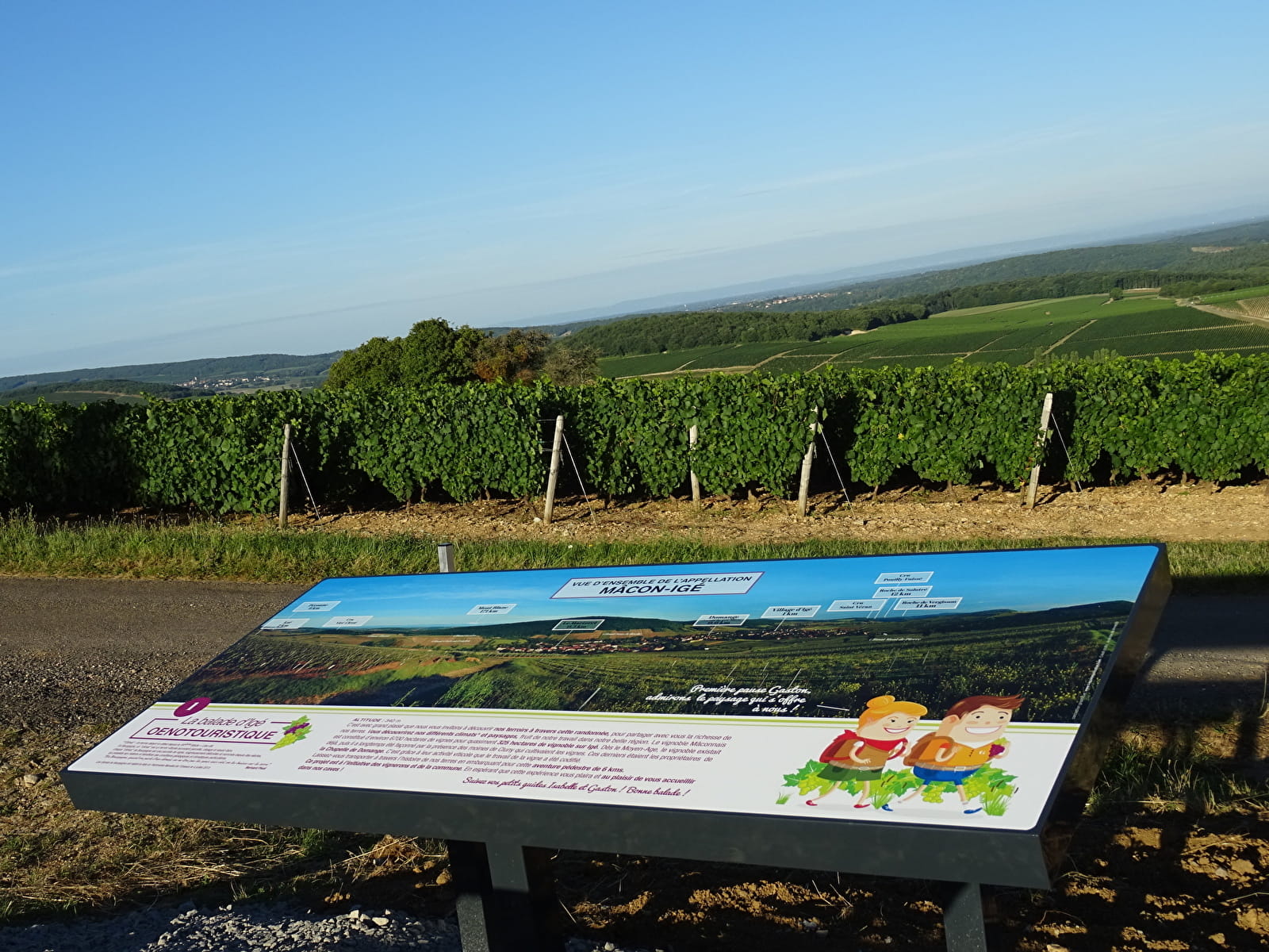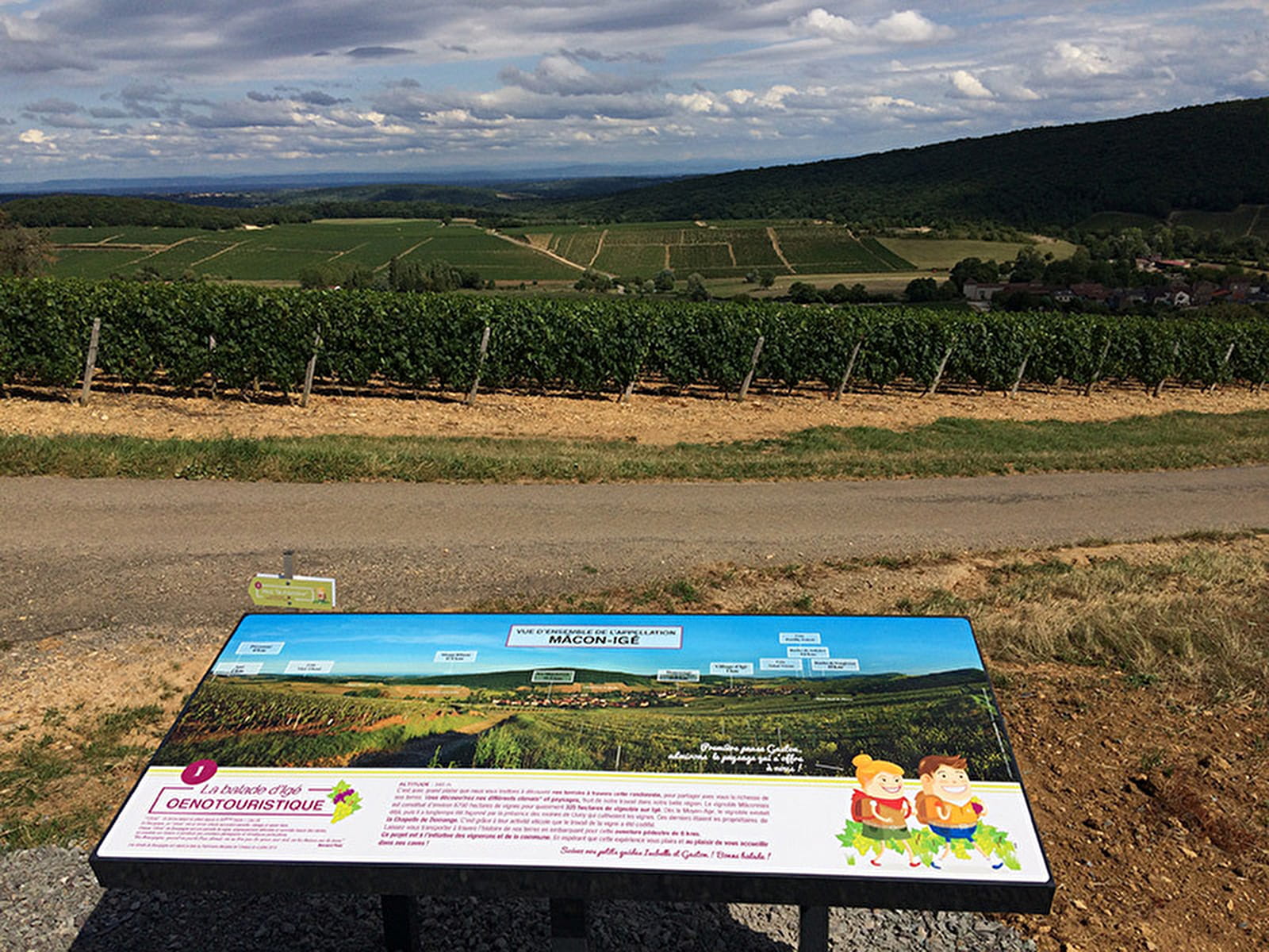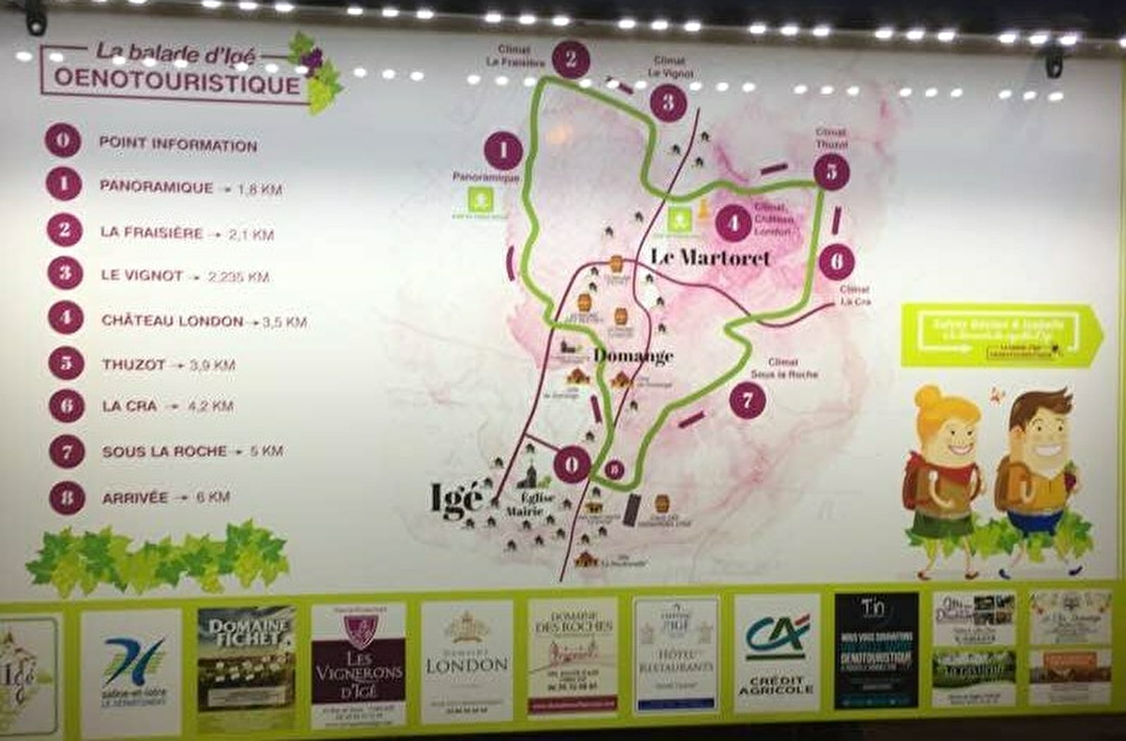 Un circuit balisé de 6 km au coeur du village viticole d'Igé et de l'appellation Mâcon-Igé. Cette randonnée, au départ de la place de l'église, chemine au coeur de 6 Climats aux noms évocateurs, dans des parcelles de vignes produisant des vins de qualité. Une balade panoramique où le Mont-Blanc fait parfois des apparitions attirant le regard. Une table de lecture du paysage, deux aires de pique-nique et des panneaux d'information jalonnent le parcours de ce terroir où les vignerons ont façonné les coteaux. Suivez Gaston et Isabelle dans ce périple oenotouristique. Amateurs de vins, poussez les portes des domaines Fichet, des Vignerons d'Igé, des Roches... Ils sauront vous faire déguster avec passion et modération le fruit de leur travail.