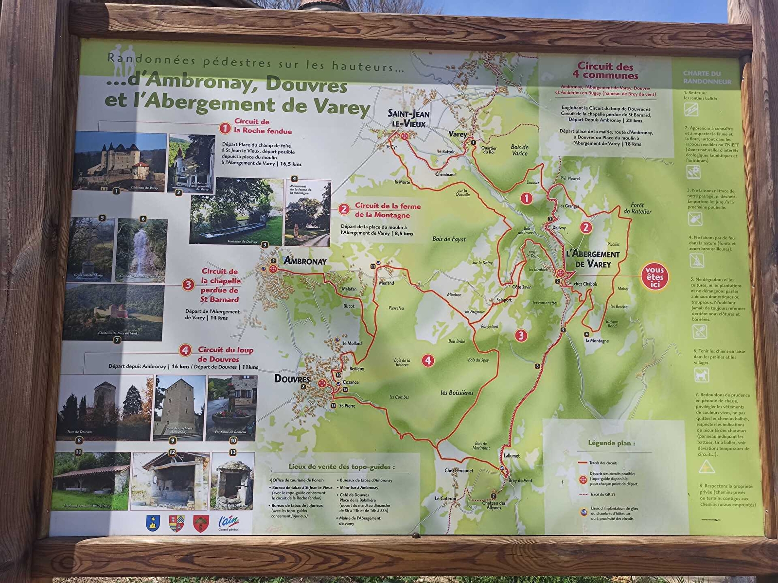 L'itinéraire traverse Douvres, le hameau de Brey de vent (Ambérieu-en-Bugey) et l'Abergement-de-Varey. Il vous offrira de croiser son petit patrimoine local sous forme de lavoirs, croix, fontaines et de fours banaux. Egalement sur le chemin, des sites naturels comme la cascade de Pisse loup (baignade interdite) et historiques comme un aperçu du château des Allymes (visitable toute l'année) ou la tour de Douvres.