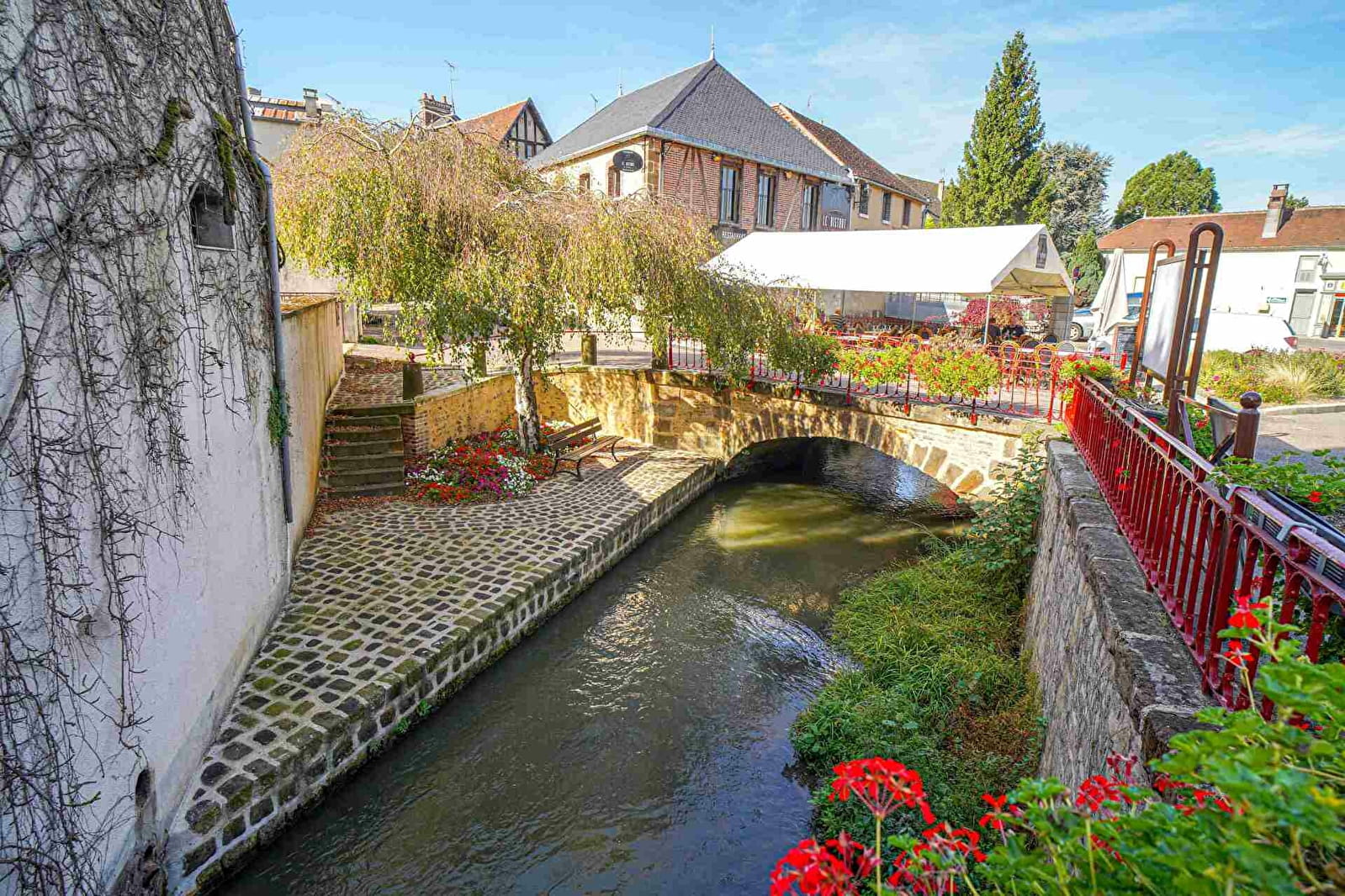 (D/A) Face à l'entrée du château, partir sur la gauche dans la Rue Michel Lepelletier. Passer les deux ponts successifs qui enjambent le Ruisseau du Bourdon. Prendre sur la droite le chemin qui longe un bras du ru. Atteindre le lavoir, virer à droite, puis à gauche dans la Ruelle du Bourneuf, une centaine de mètres plus loin.