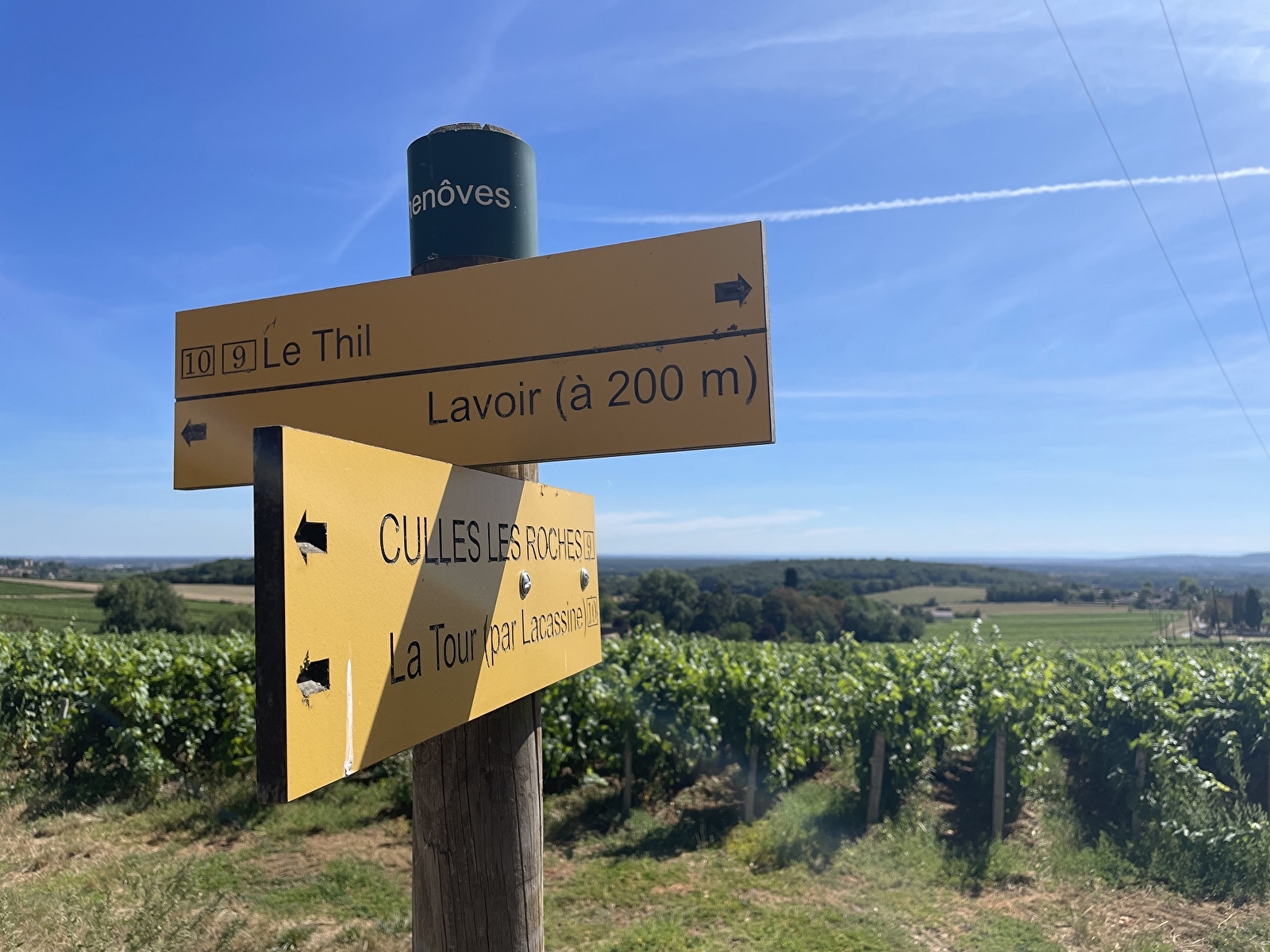 - Descendre le sentier étroit et pierreux au bout de la maison et traverser le hameau de la Tour situé sur la commune de SAINT-VALLERIN. Suivre le balisage dans les vignes, couper la D981 pour rejoindre le hameau de la Guiche, commune de JULLY-LES-BUXY.