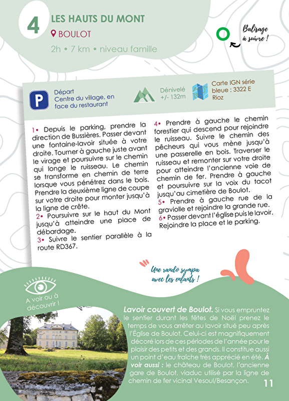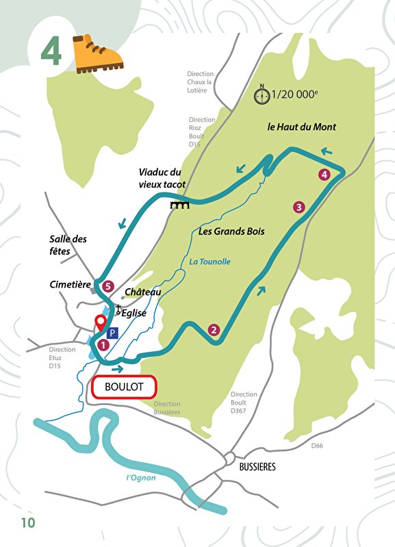 4• Prendre à gauche le chemin forestier qui descend pour rejoindre le ruisseau. Suivre le chemin des pêcheurs qui vous mène jusqu’à une passerelle en bois. Traverser le ruisseau et remonter sur votre droite pour atteindre l’ancienne voie de chemin de fer. Prendre à gauche et poursuivre sur la voix du tacot jusqu’au cimetière de Boulot.