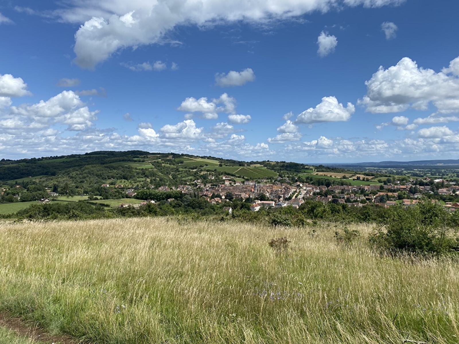 - Peu après le croisement des routes, tourner à droite pour monter dans les vignes vers le mont Saint Roch. On traverse une plantation de cèdres de l’Atlas pour arriver au sommet. C’est là qu’en 1661, une famille de Saint-Gengoux-le-National fait le vœux de construire une chapelle dédiée à St Roch si elle échappe à la peste qui frappe la région, cette chapelle est érigée en 1662 à l ‘endroit ou se trouve actuellement la statue de la Vierge. De ce point de vue vous pouvez admirer la Cité médiévale de Saint-Gengoux-le-National.