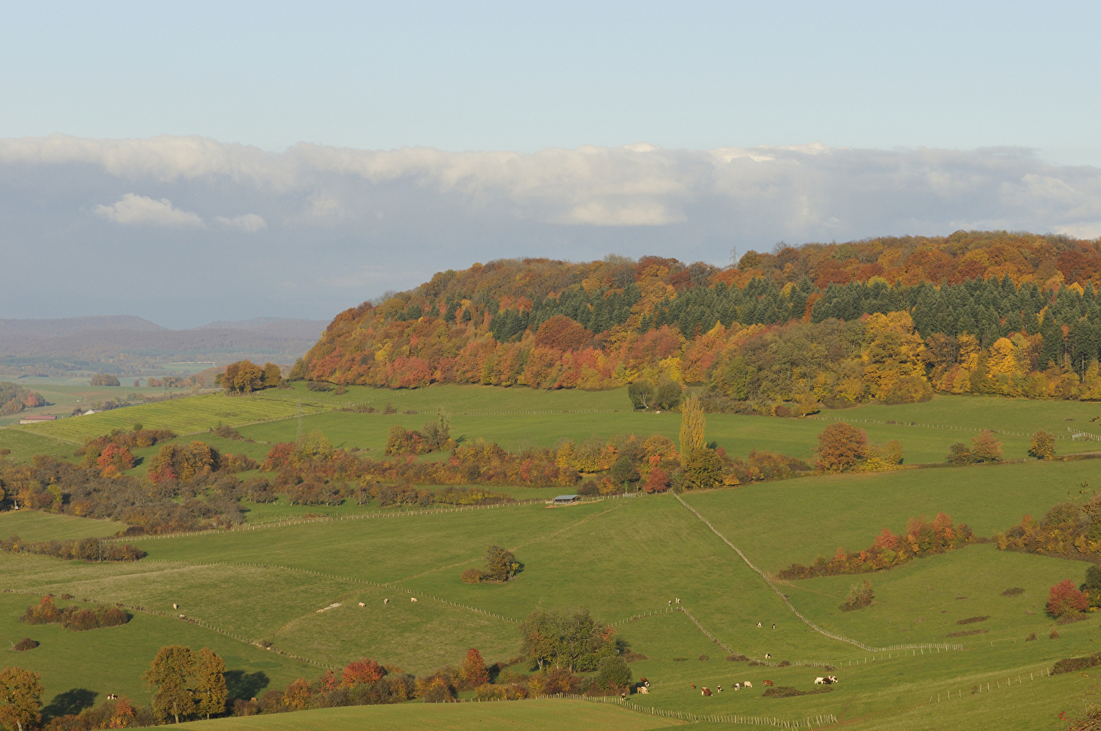 Une randonnée pour se mettre à l'ombre quand la chaleur estivale est excessive. Cette grande balade alterne forêt profonde, bosquet et pâturages où les Montbéliardes paissent en paix. L'occasion aussi de découvrir l'autre pays de la mirabelle !