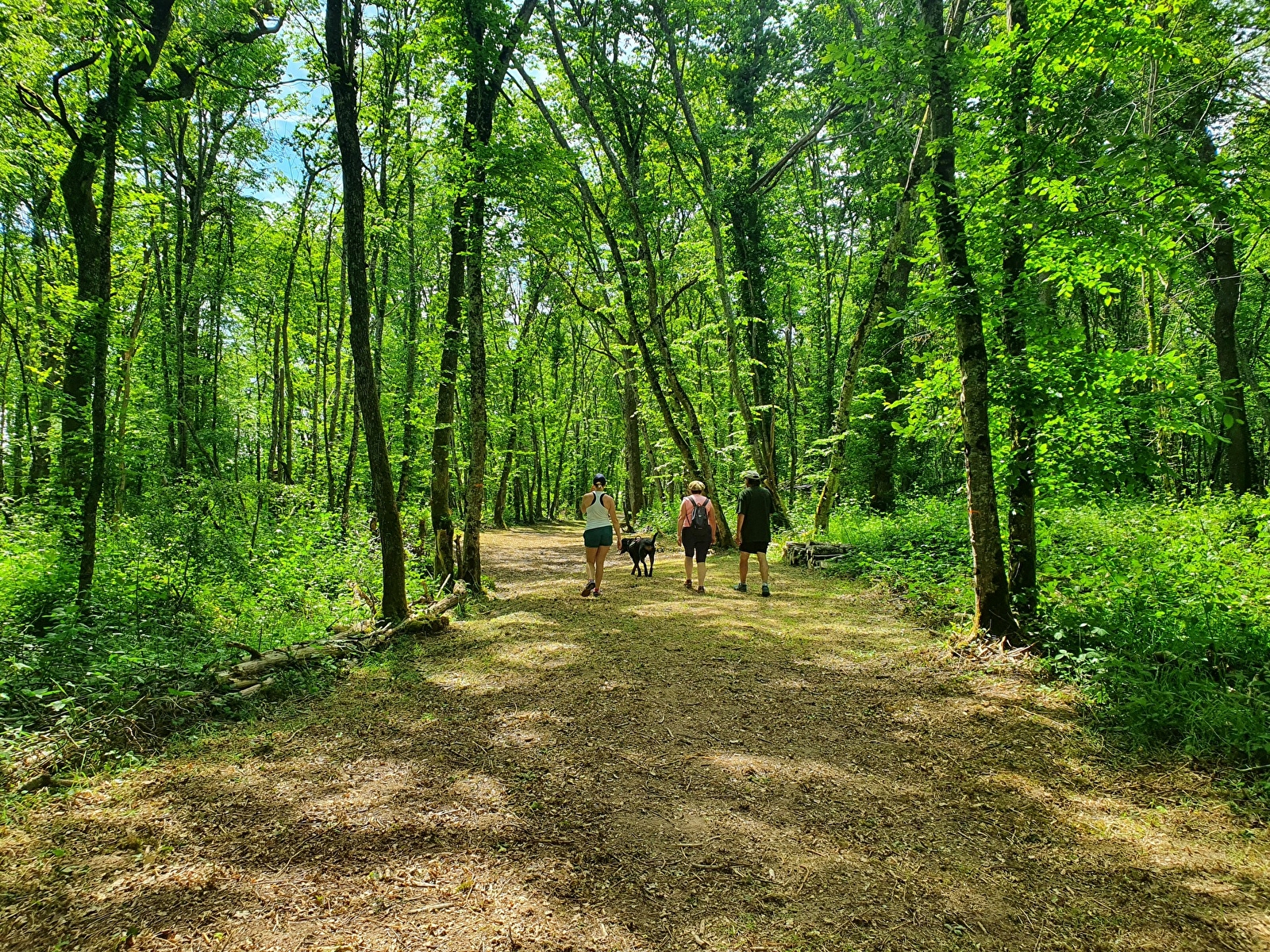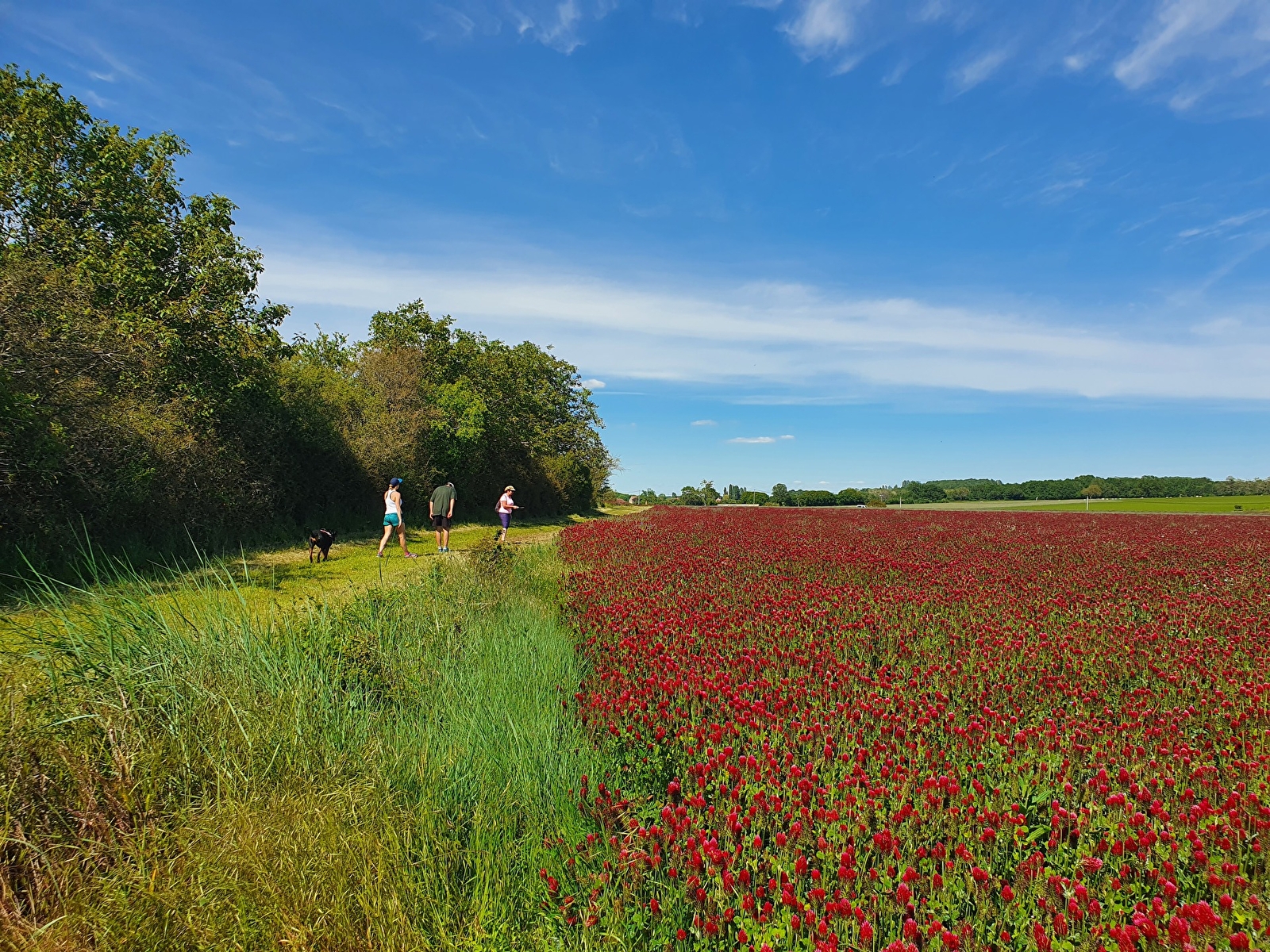 Petite randonnée vallonnée à travers champs et bois, en partie au soleil.